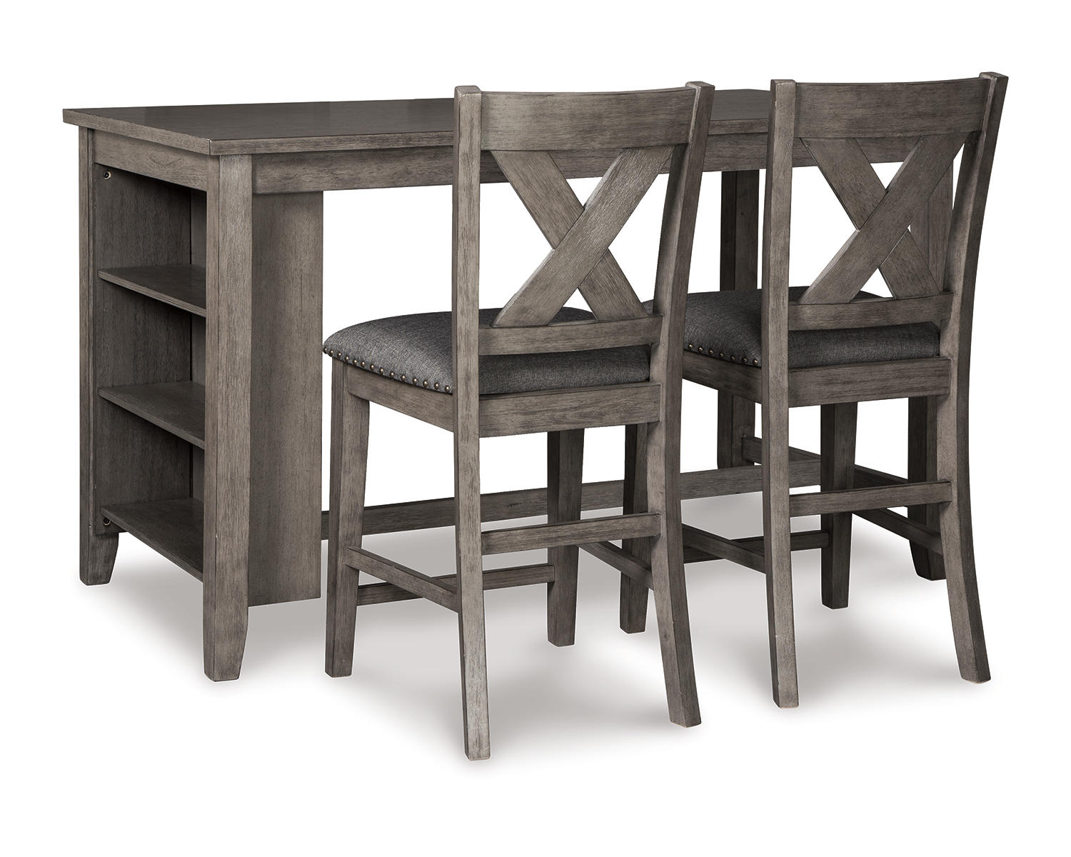 - Includes 2 barstools in a cohesive gray finish