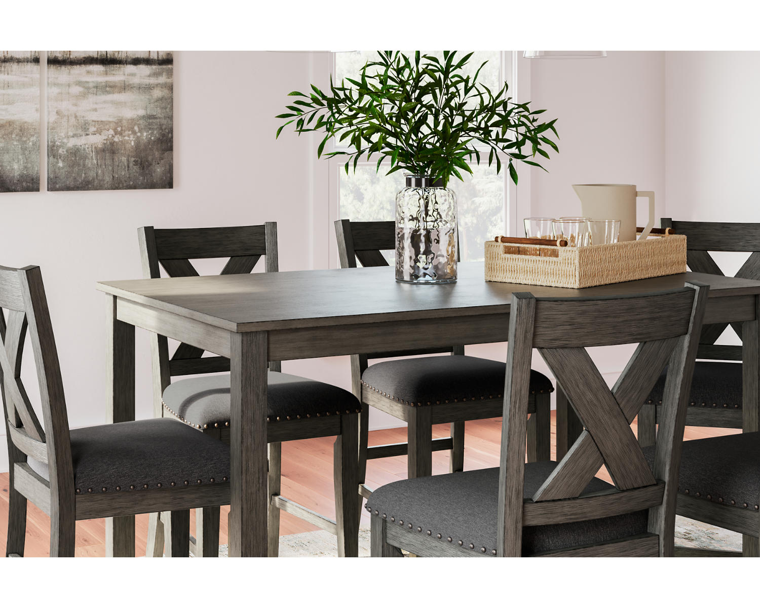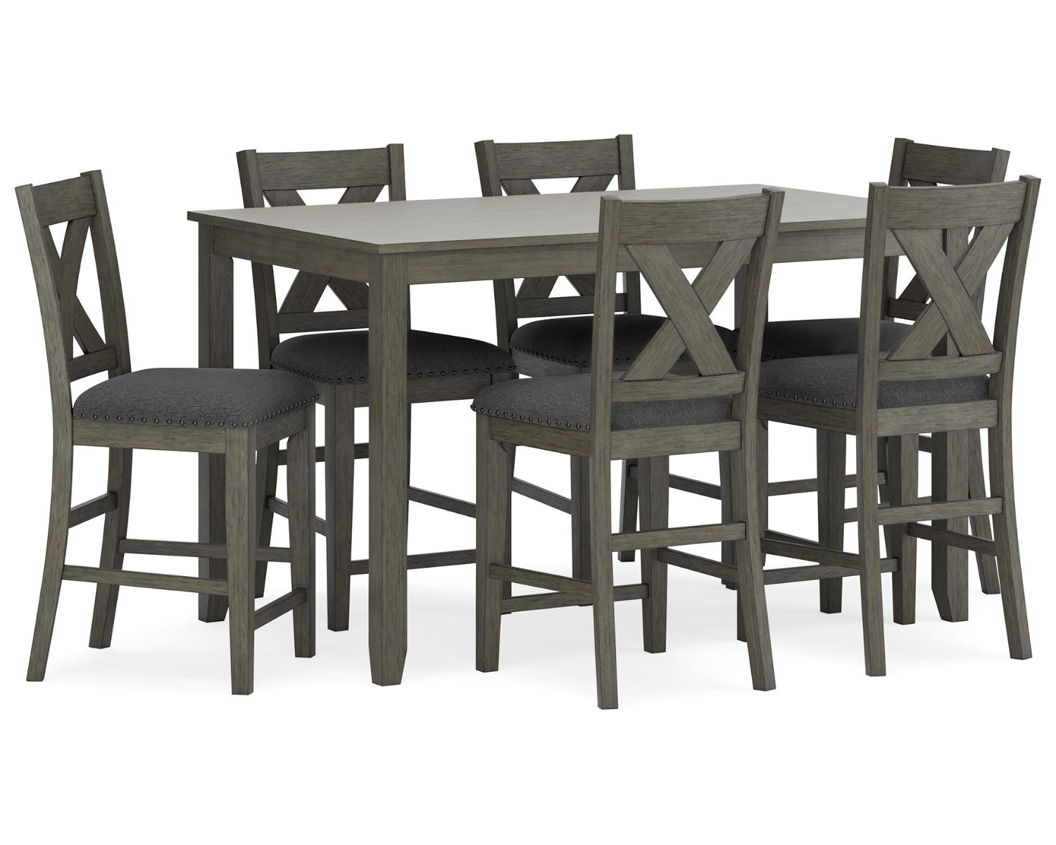 Meet Caitbrook, a counter-height dining set that brings casual elegance to your kitchen or dining area. This seven-piece ensemble includes one rectangular counter-height dining table and six matching bar stools, designed for everyday meals and relaxed gatherings. In a versatile gray finish, it pairs easily with a wide range of decors and color schemes.