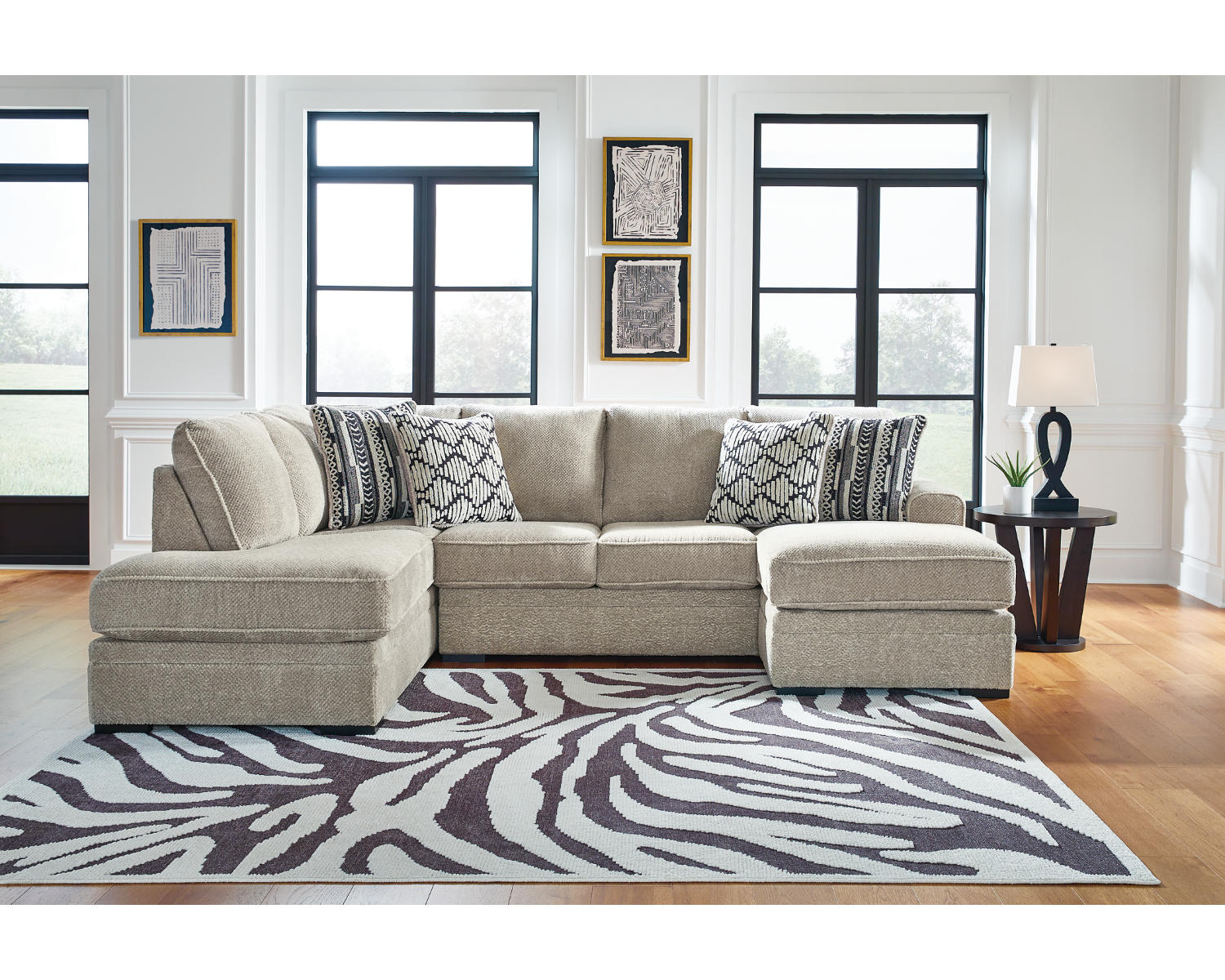 Introducing the Calnita 2-Piece Sectional with Chaise, a versatile seating solution designed for modern homes. This two-piece configuration combines a spacious sectional with a chaise for extended lounging, making it ideal for family rooms, living spaces, or entertaining guests. Upholstered in sisal fabric, it delivers a clean, contemporary look that complements a wide range of décors.