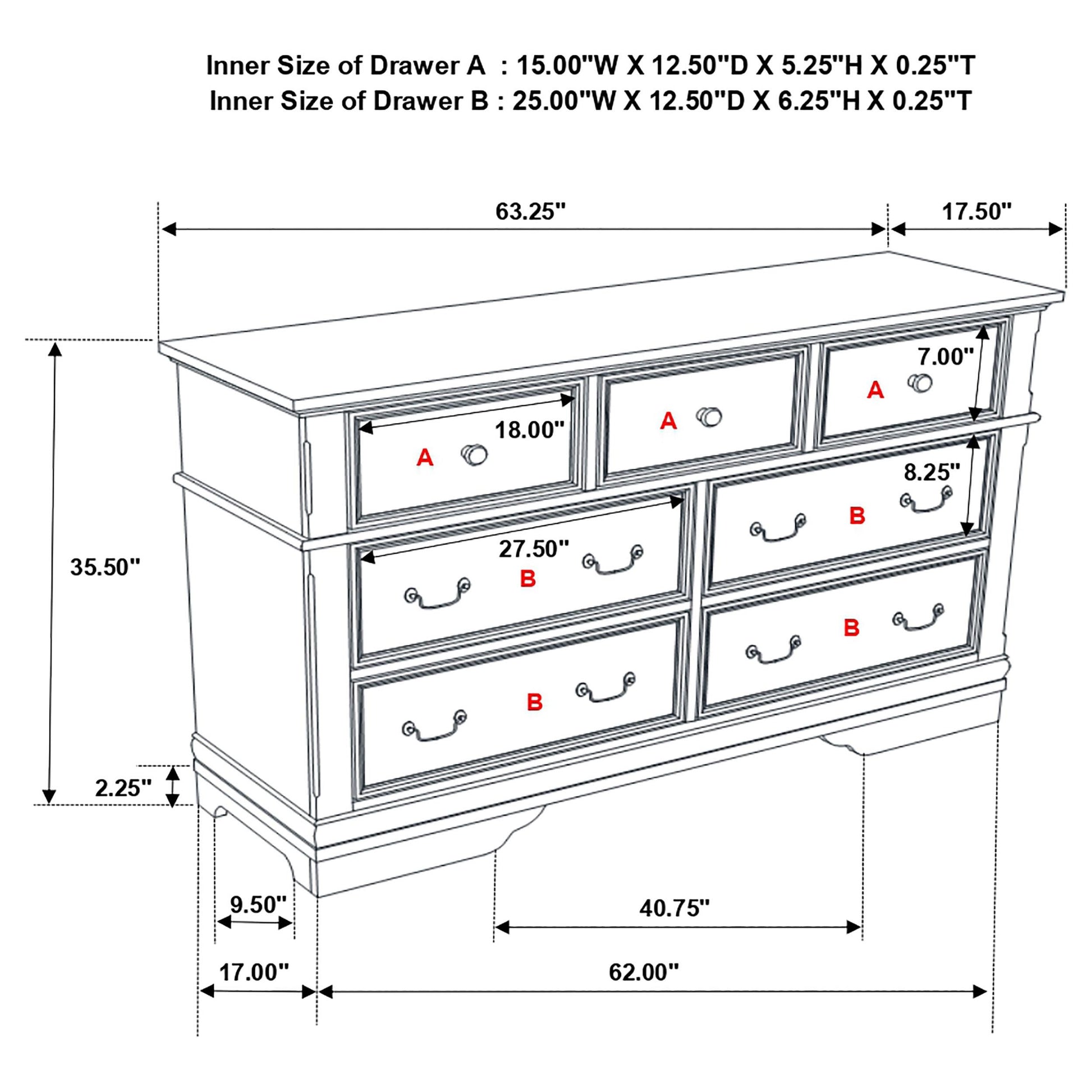 - 7 roomy drawers provide ample storage for clothing, linens, and personal items.