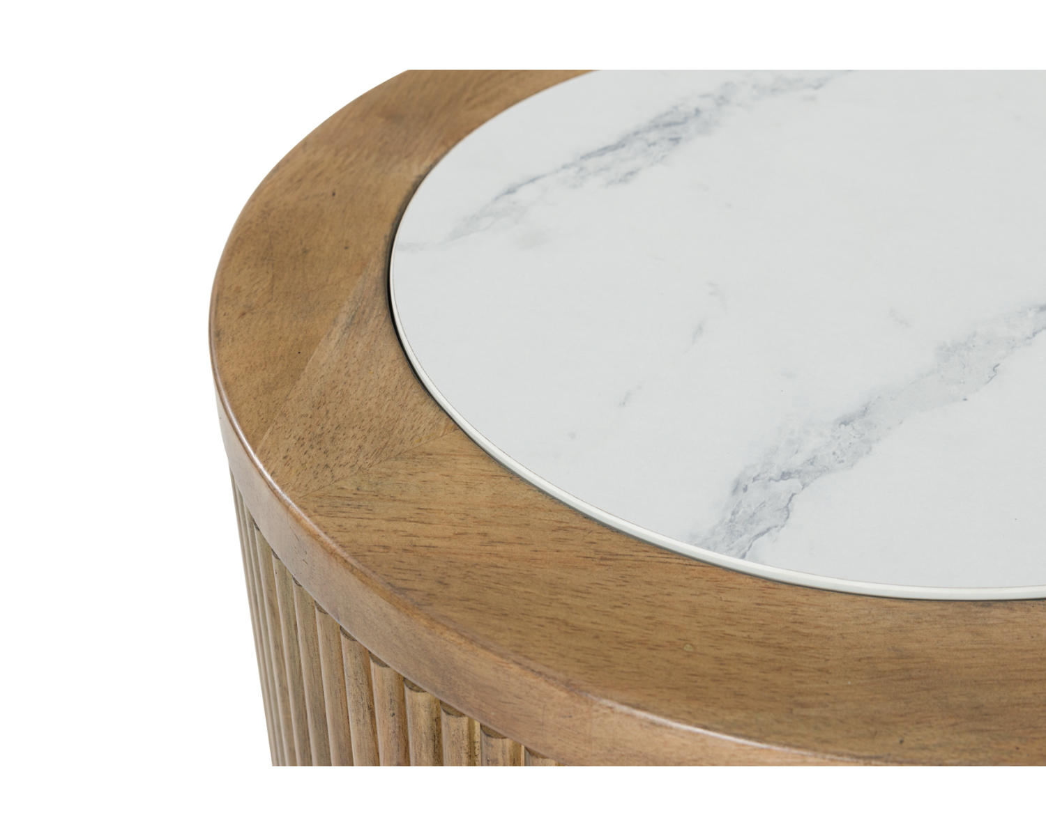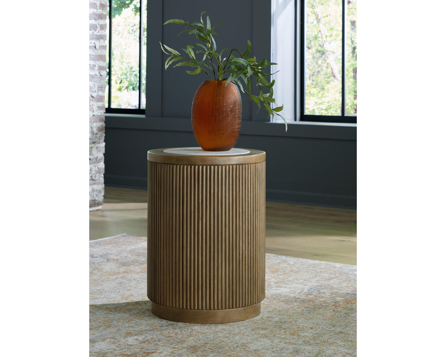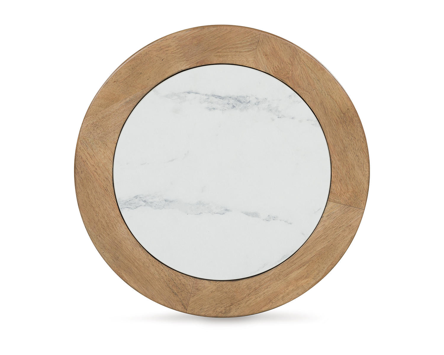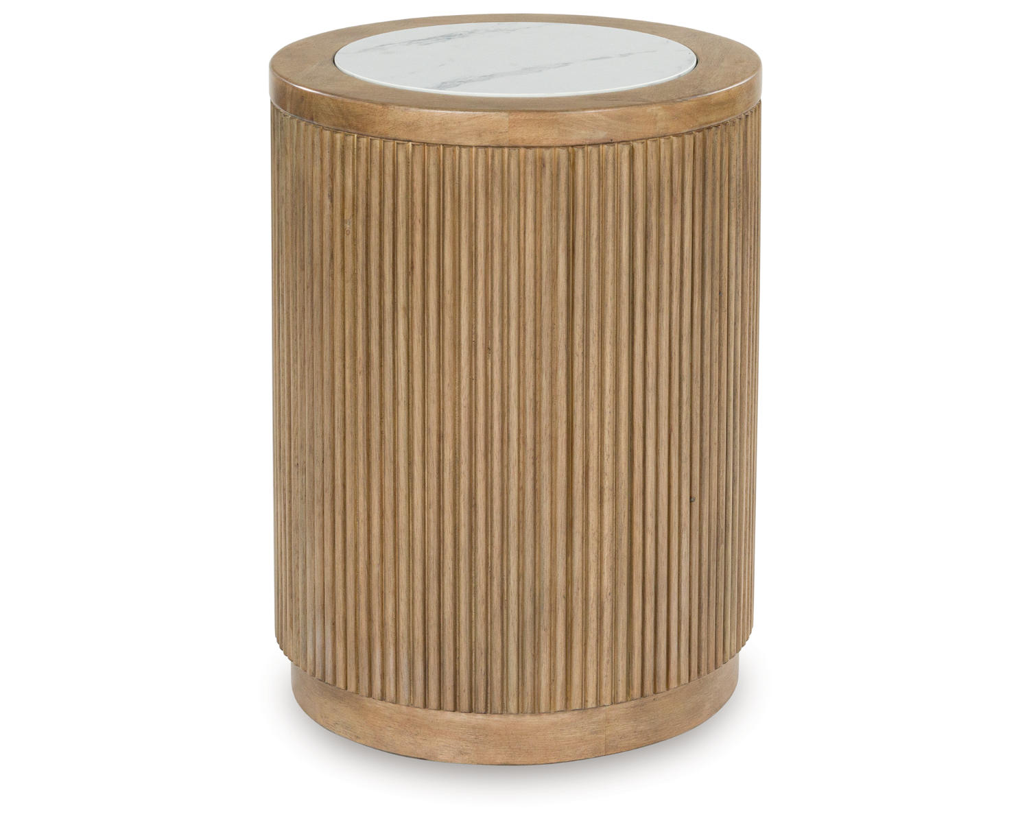 The Camdill End Table is a round accent piece finished in light brown and white, designed to add a touch of subtle elegance to any living space. This versatile table provides a practical surface for drinks, remotes, and decor, while maintaining a clean and understated look.