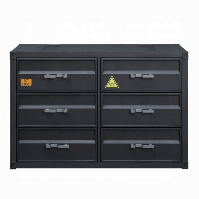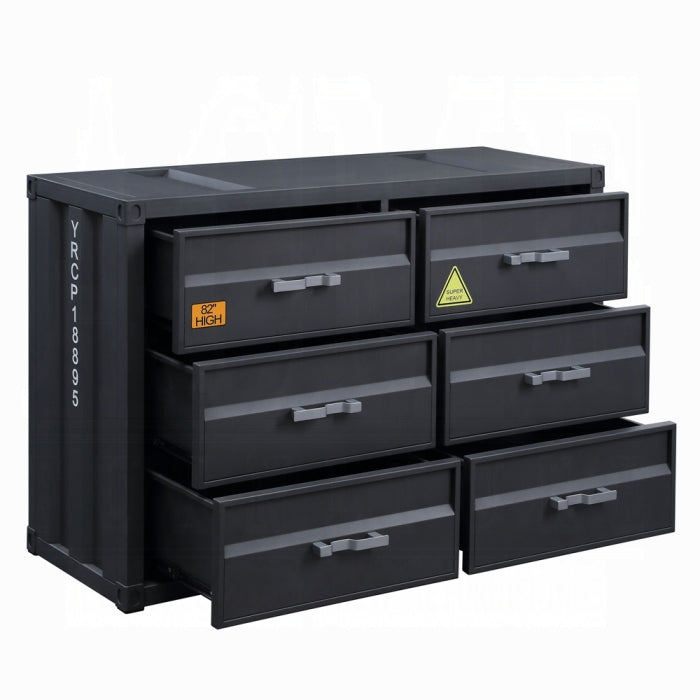 Bold industrial accents exude a funky New York loft vibe that makes an immediate impact to your space. The Cargo Dresser embodies true industrial design with warehouse style, featuring a unique shipping container appearance and a gunmetal finish that enhances all design elements. Six storage drawers provide practical organization with rugged charm.