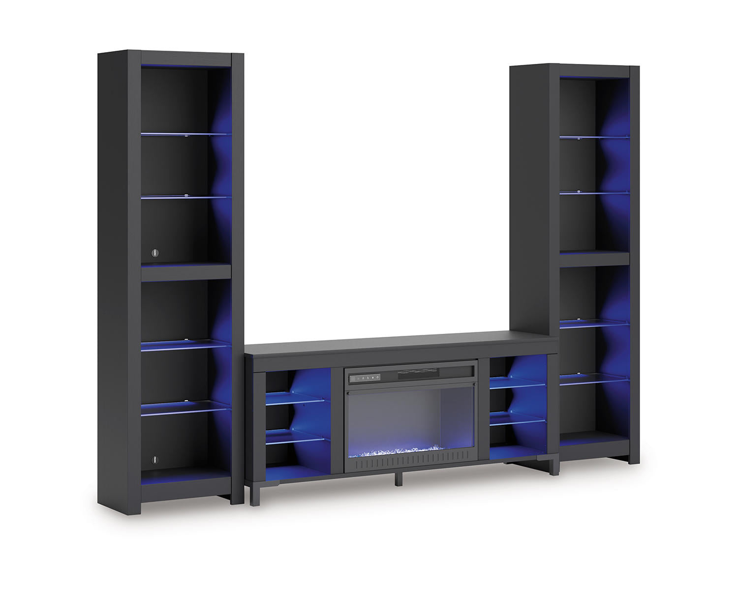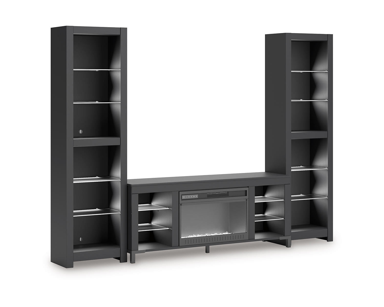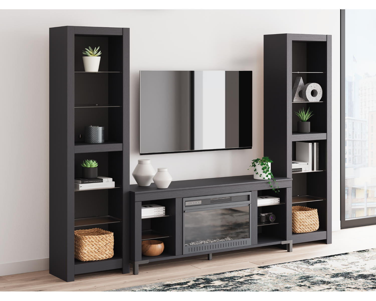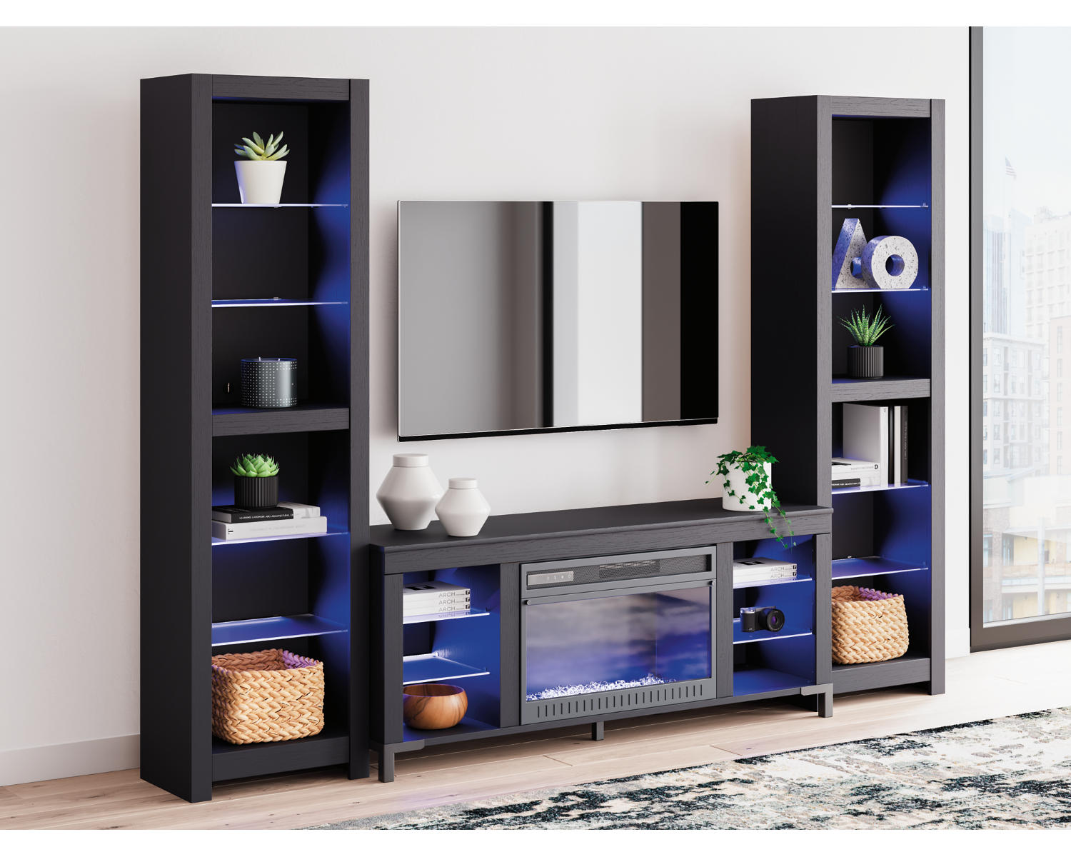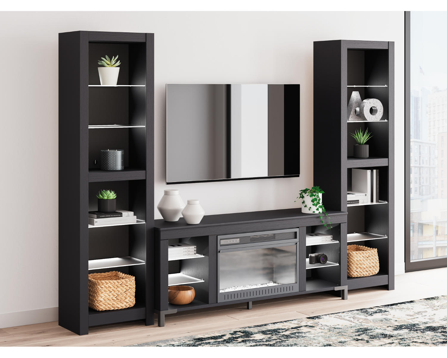 The Cayberry 3-Piece Entertainment Center with Electric Fireplace in Black offers modern style with cozy ambience for your living space. This three-piece setup combines a sleek black finish with a built-in electric fireplace to create a warm focal point, while providing practical space for your media and display items. Designed for homes that value both form and function, it adapts to a range of room layouts.