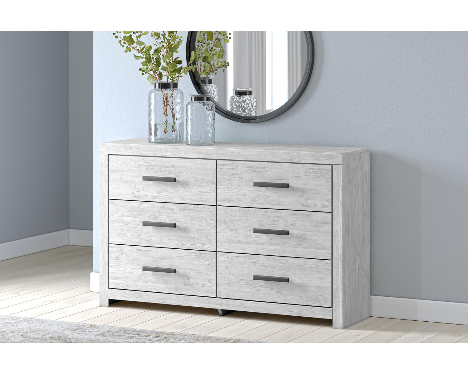 Introducing the Cayboni Dresser, a six-drawer storage solution in a whitewash finish designed to bring order and a soft, timeless look to your bedroom. Built for everyday use, it offers ample storage for clothes, accessories, and linens. Simple, versatile, and easy to integrate into most decors, this dresser is ideal for organized, clutter-free spaces.