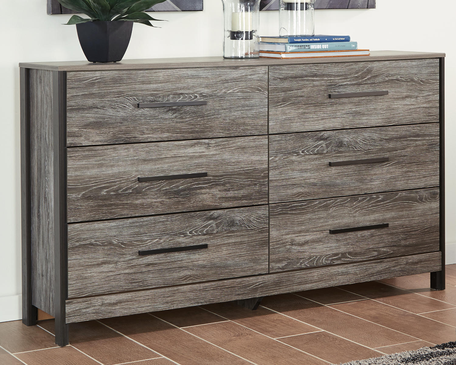 The Cazenfeld Dresser is a six-drawer storage solution designed for bedrooms that need organized space and a clean, modern look. With a sleek Black/Gray finish, it blends understated style with practical function for everyday use. This dresser is ideal for anyone seeking reliable storage without sacrificing room aesthetics.