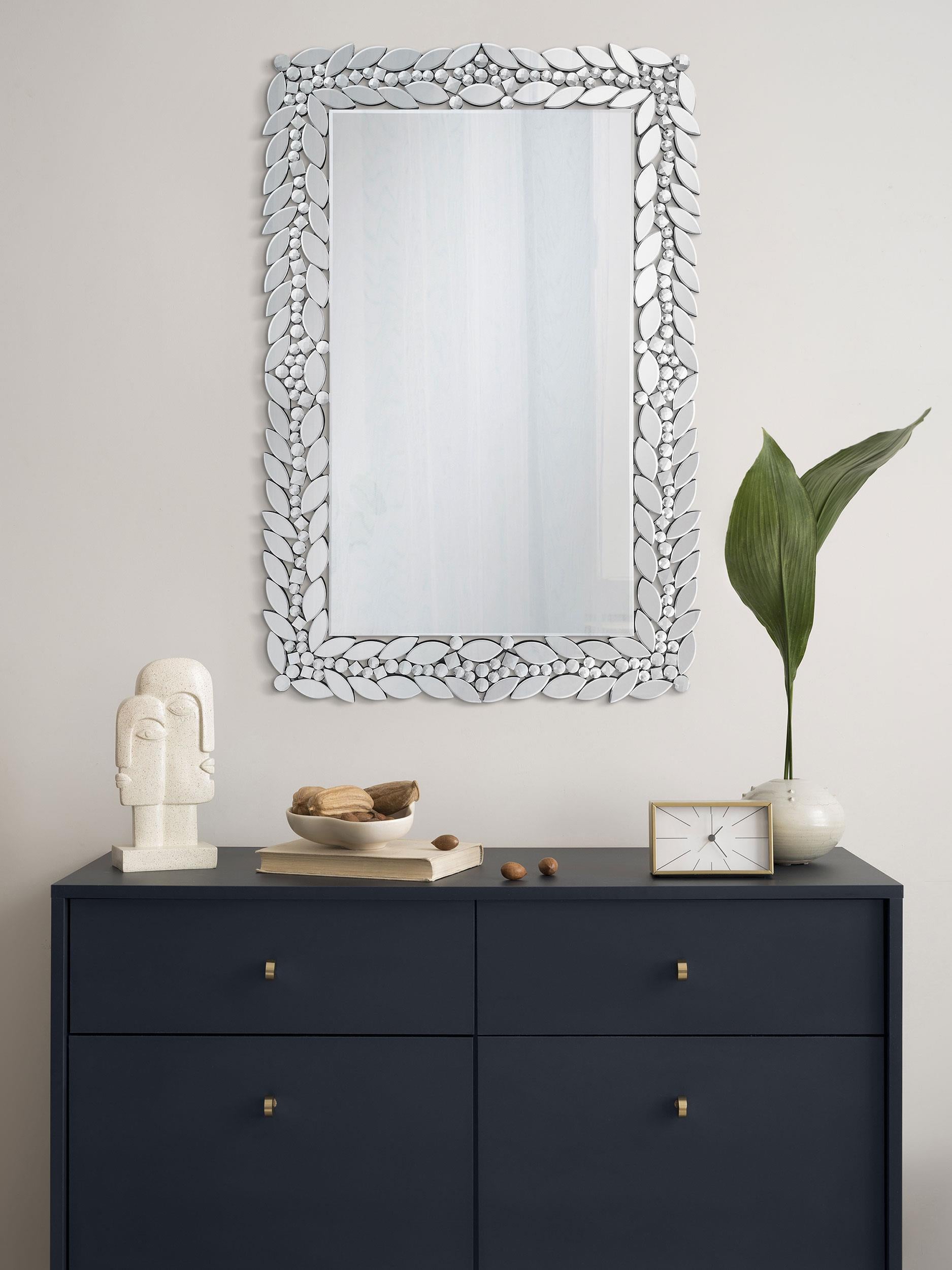 elevate your space with the Cecily wall mirror, a striking piece that blends a graceful leaf-border frame with crystal accents in a sleek silver finish. Designed for entryways, living rooms, bedrooms, or hallways, it adds a sense of light and sophistication while providing a large reflective surface. The generous 32 x 47 inch format makes a bold statement without overpowering your decor.
