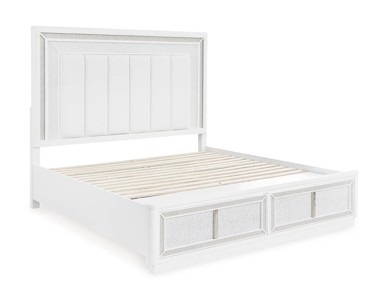 Meet the Chalanna California King Upholstered Storage Bed — a white, fabric-covered bed designed for modern bedrooms that value both style and practicality. It pairs a spacious sleeping area with hidden storage, helping you keep linens, blankets, and other essentials neatly tucked away. Crafted for those who want a clean, refined look without sacrificing under-bed storage.