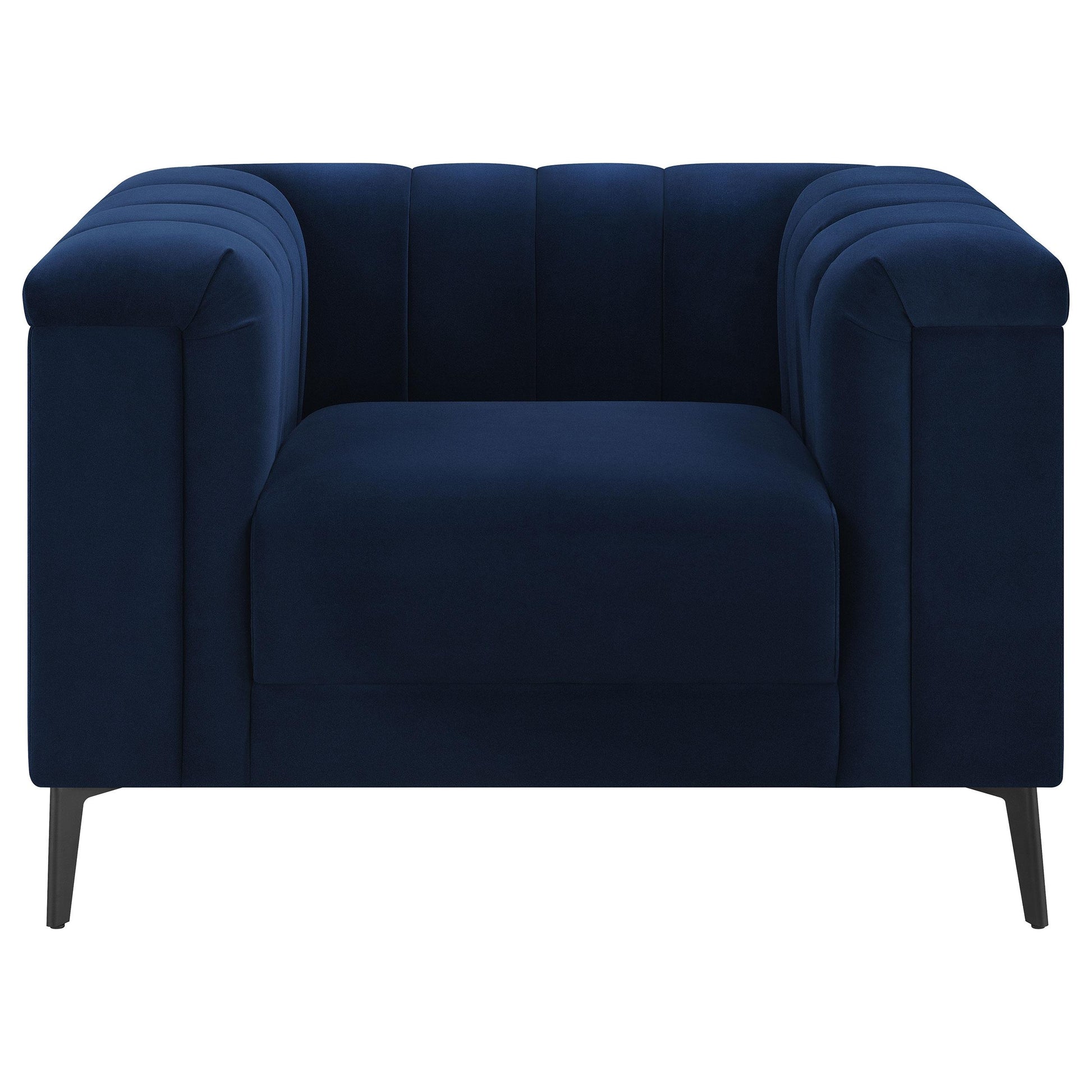 Introducing the Chalet Upholstered Tuxedo Arm Tufted Chair in a rich blue finish. This elegant armchair is designed for living rooms, home offices, or reading nooks, offering classic style with everyday comfort. The blue upholstery adds a refined pop of color that pairs easily with a variety of decors.