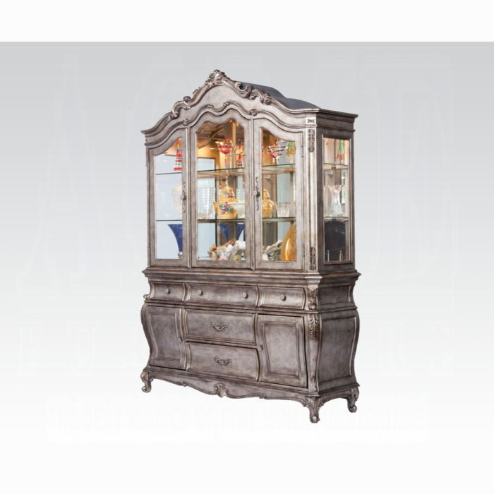 Meet the Chantelle Buffet & Hutch — a refined two-piece dining storage solution built for entertaining and everyday use. With an antique platinum finish and a thoughtful blend of wood, glass, mirror, and veneer, this set adds timeless style to any dining room. The buffet base paired with the hutch provides display-ready storage for dinnerware, glassware, and decorative accents while keeping essentials close at hand.