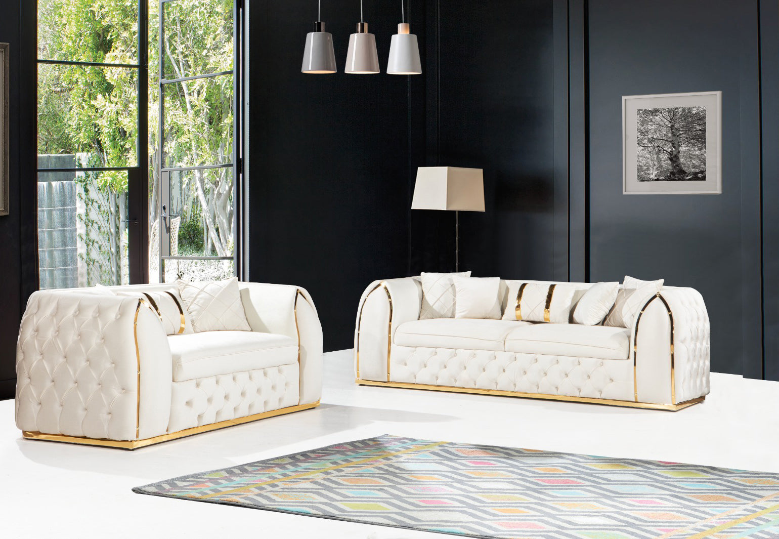 The Charisma Collection brings together elegance and modern design for a refined living room centerpiece. Its tufted white upholstery and sleek silhouette create a sophisticated focal point for contemporary spaces. The sofas showcase gently curved arms adorned with gold accents, delivering a striking visual contrast and timeless appeal.