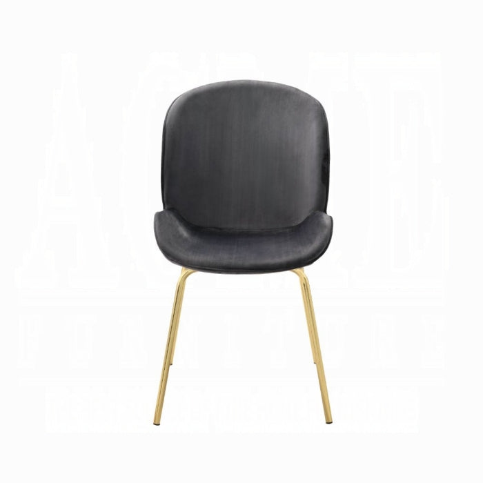 Meet the Chuchip Side Chair Set, a pair of modern dining chairs designed for everyday dining and refined gatherings. Ideal for dining rooms, kitchens, or lounge spaces, these chairs blend a plush gray velvet seat with a gold-finish metal frame for a stylish, durable seating option.