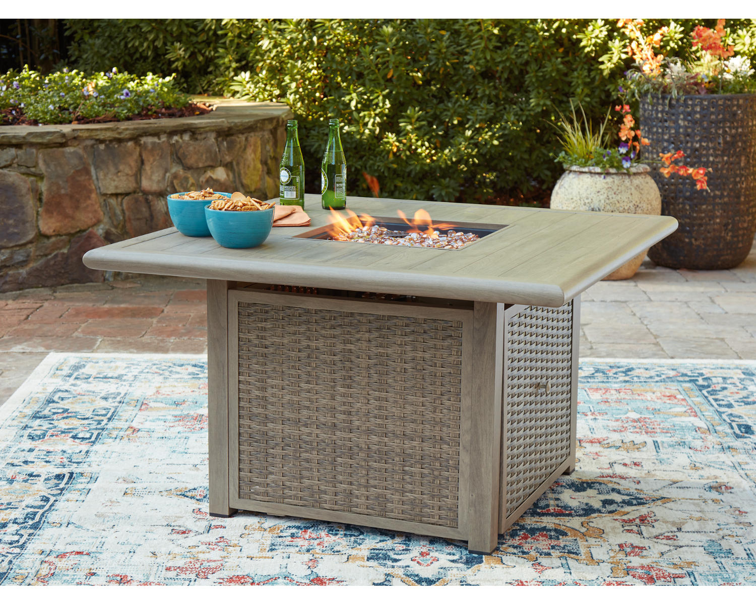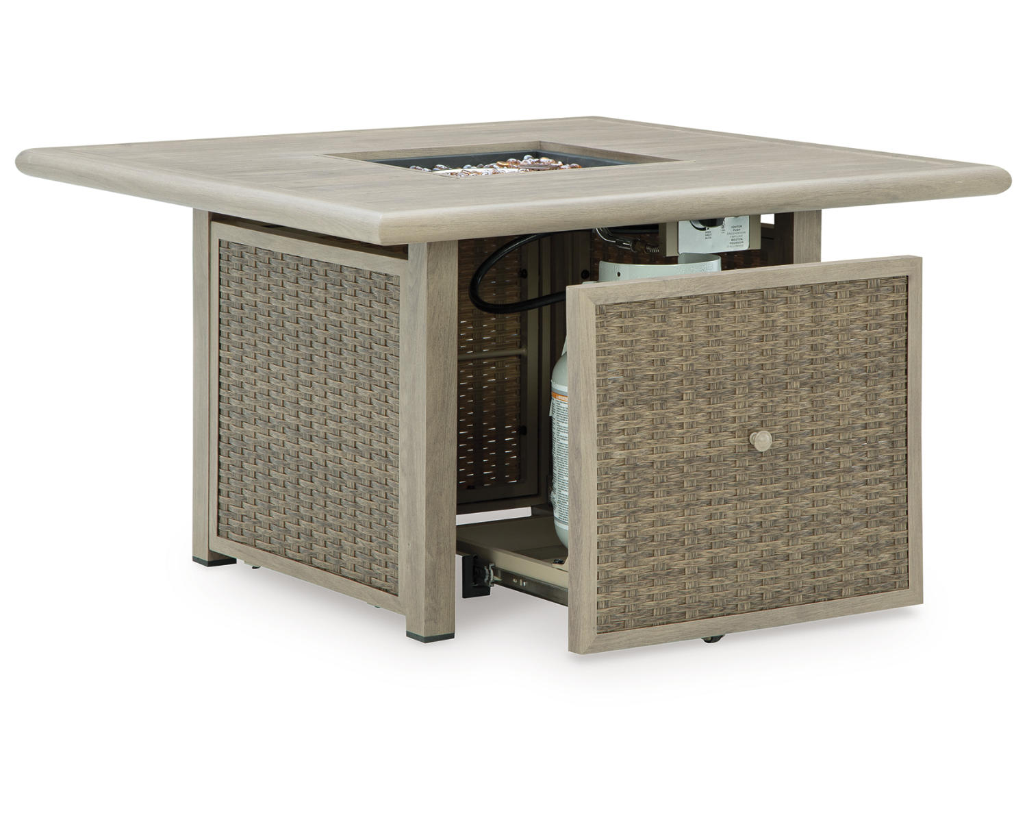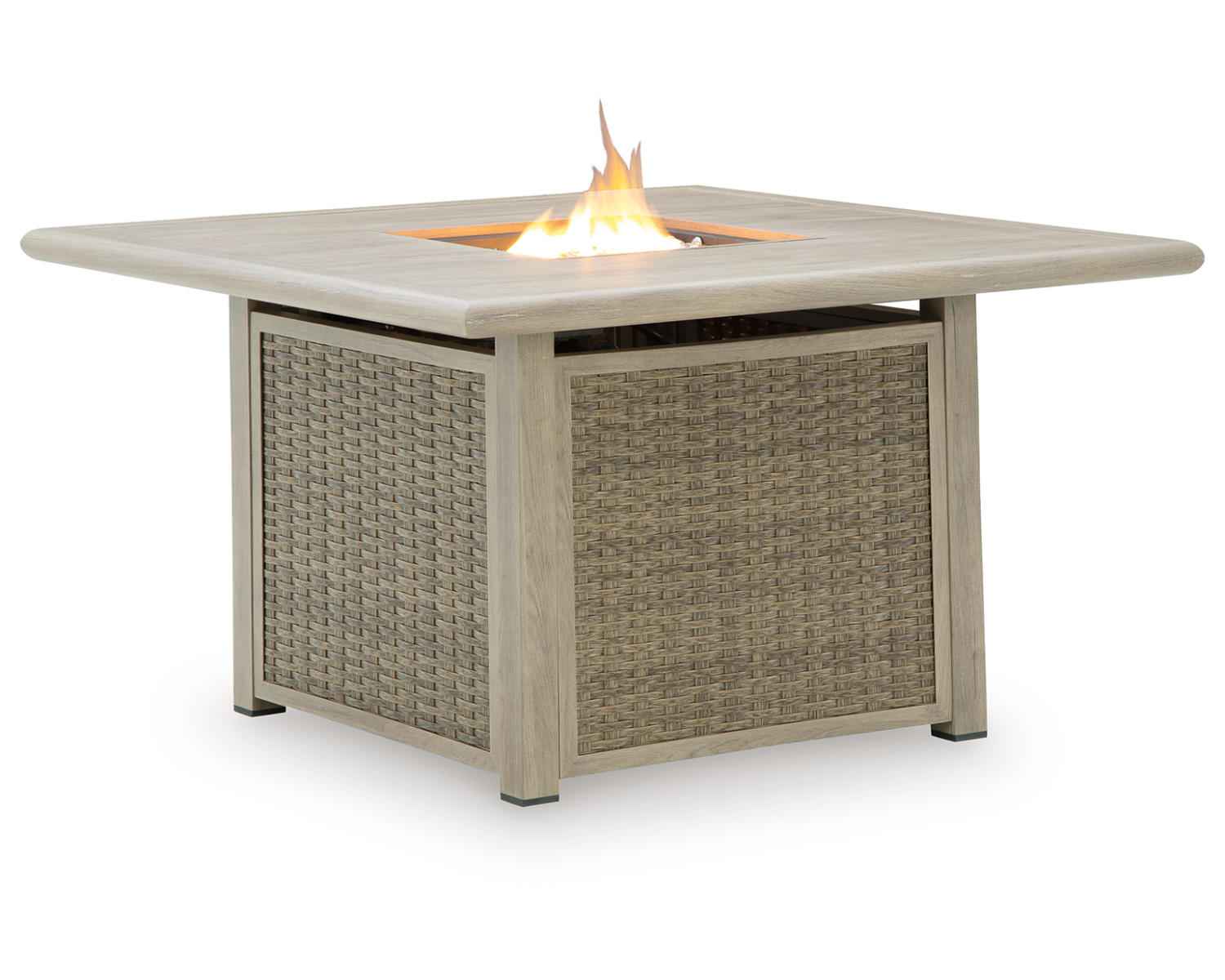 - Square fire pit table in a neutral beige finish