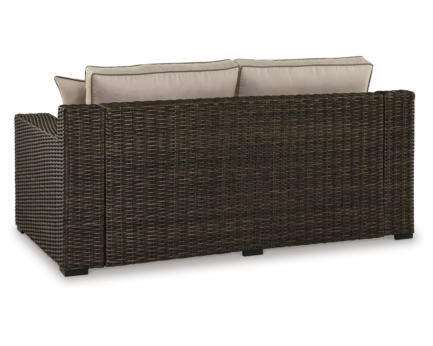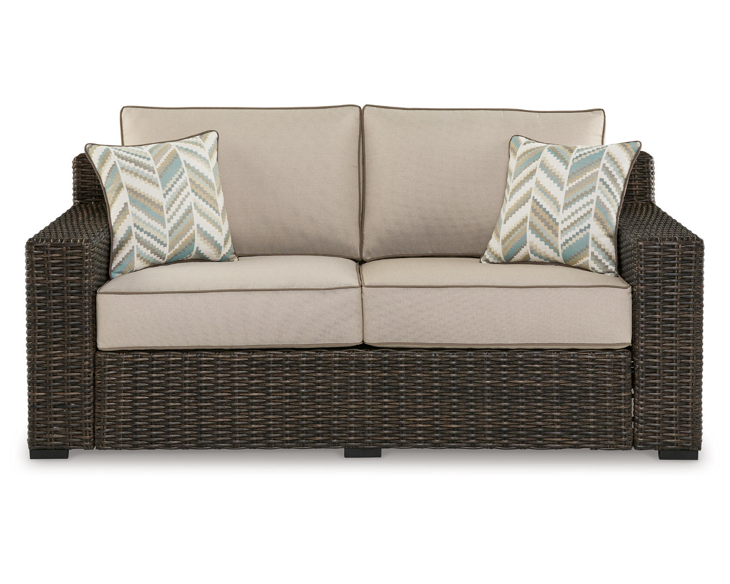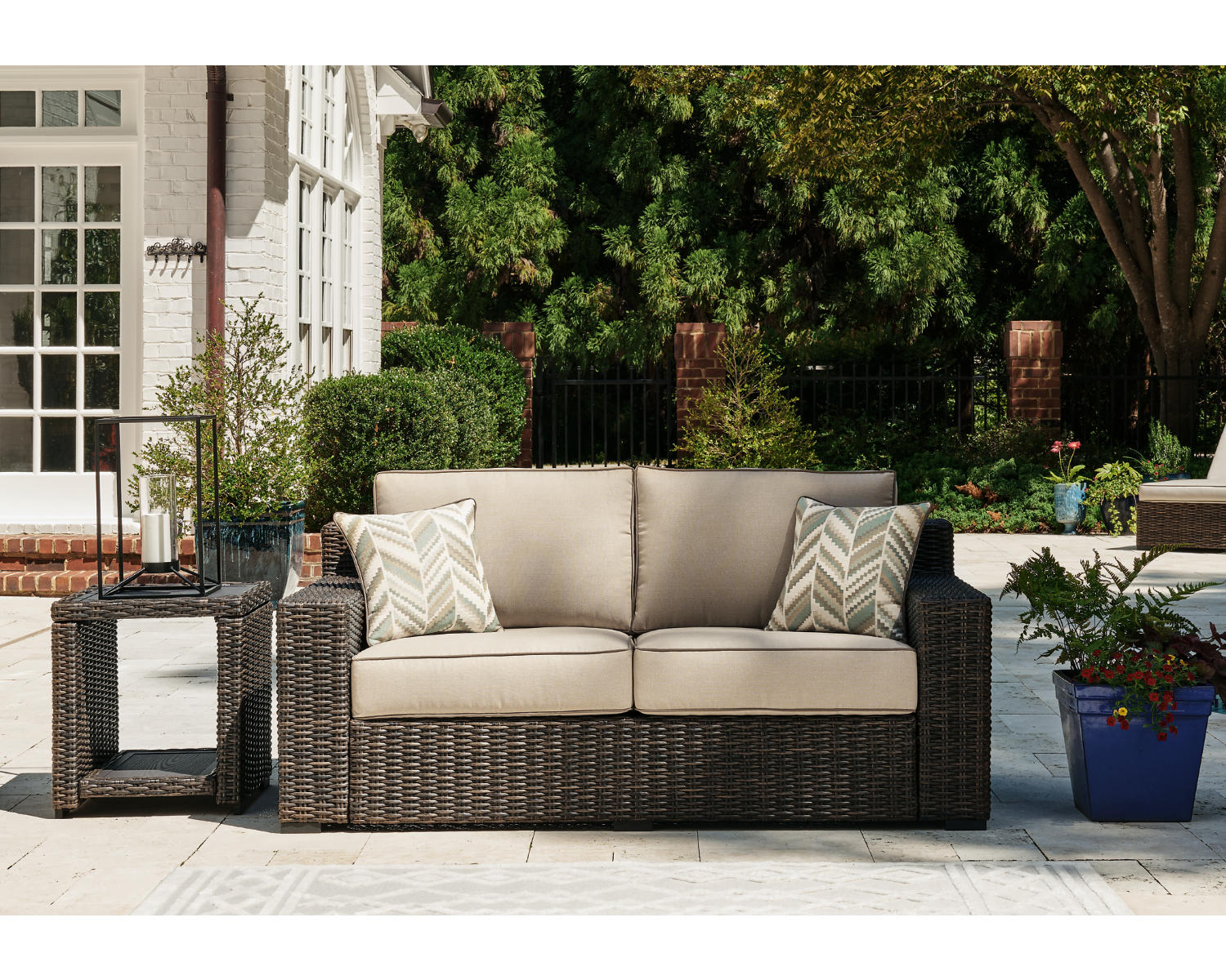 The Coastline Bay Outdoor Loveseat with Cushion brings all-weather comfort to your outdoor space. This brown loveseat is ideal for balconies, patios, or decks, offering a cozy spot for two to unwind and enjoy time outdoors. The included cushion adds plush support while maintaining a clean, low-maintenance look.