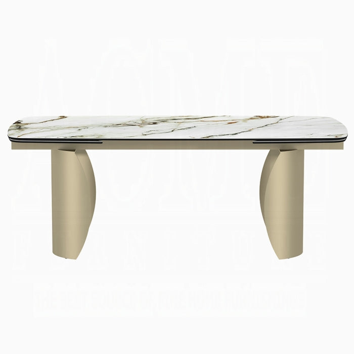 The Cora Dining Table embodies modern elegance with a luxurious golden champagne finish. This striking piece is designed for both intimate dinners and festive gatherings, serving as a focal point in your dining room. The sleek marble top paired with its stylish pedestal base creates a stunning centerpiece that elevates any dining space.