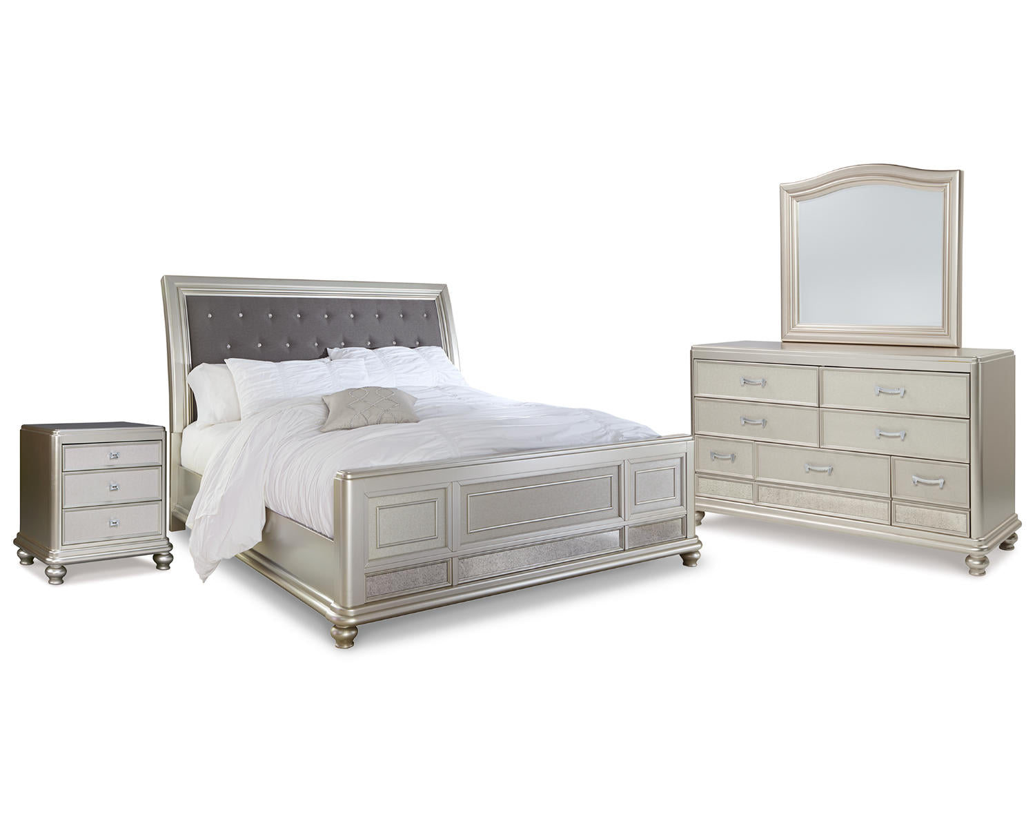 Coralayne King Sleigh Bed, Dresser, Mirror, and Nightstand — Silver