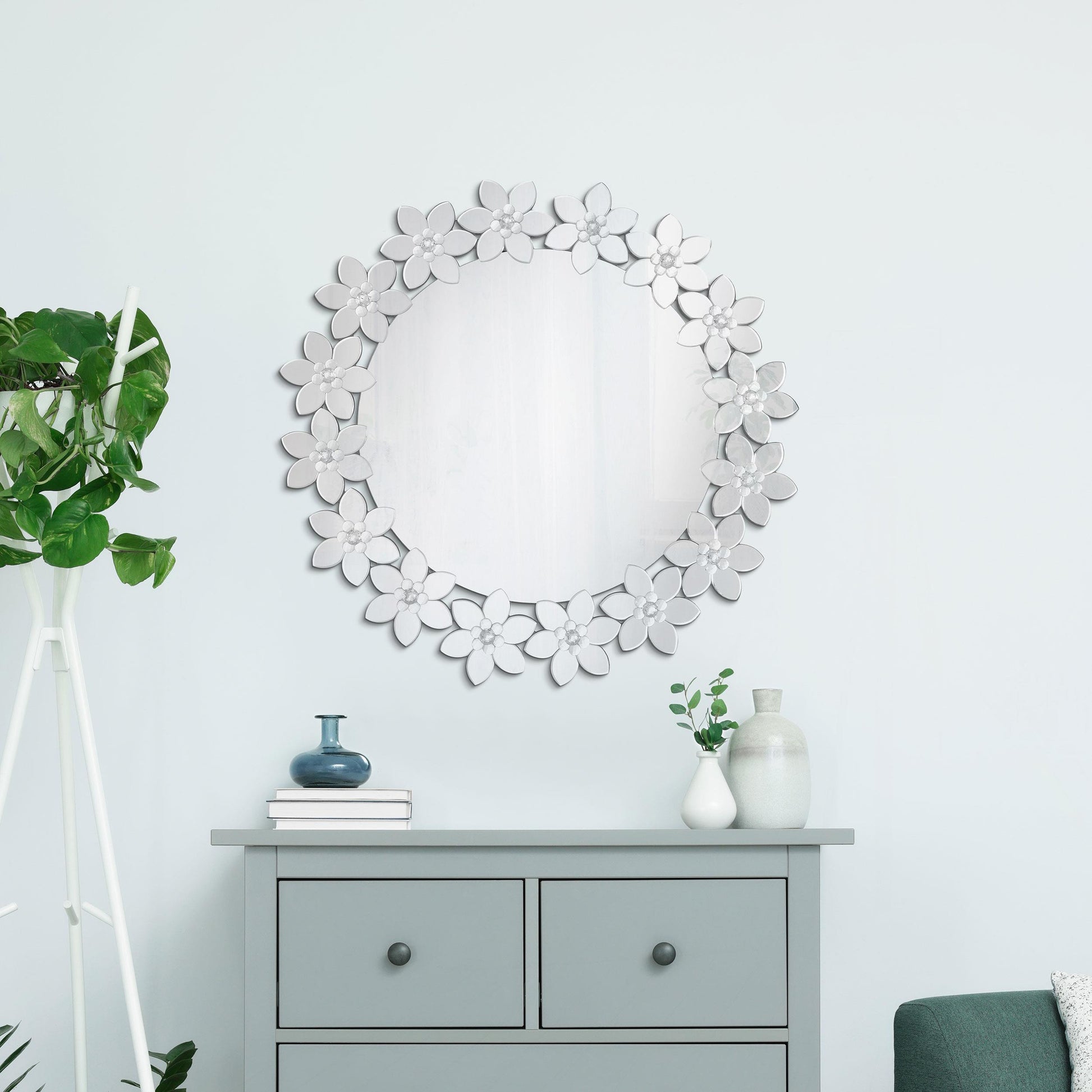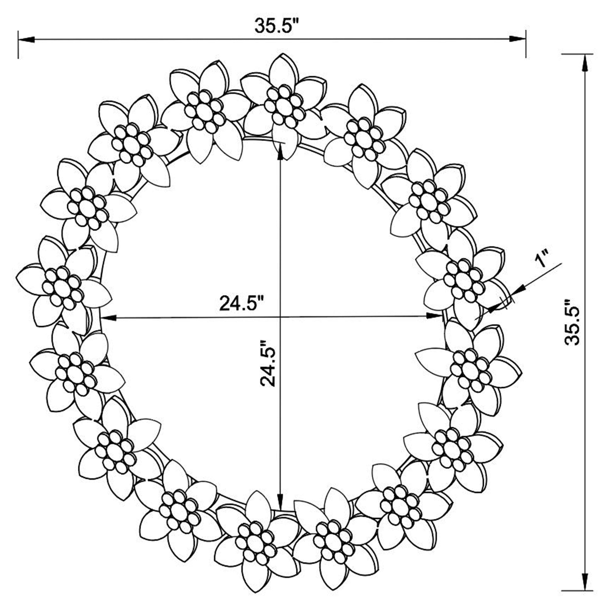 Meet Cordelia, a 36-inch round floral wall mirror finished in a shimmering silver. This statement piece is designed to brighten entryways, living rooms, bedrooms, or any wall that could benefit from reflected light and a touch of elegance. Its circular silhouette and delicate floral motif blend timeless charm with modern brightness.