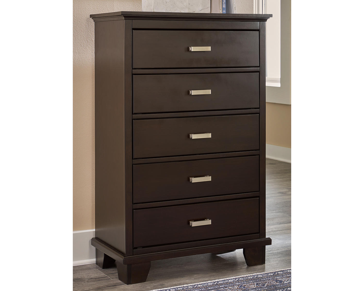 Introducing the Covetown Chest of Drawers—a five-drawer storage solution in a dark brown finish. Designed for bedrooms, guest rooms, or compact spaces, it offers straightforward organization with a clean, timeless look that blends with a range of decors.