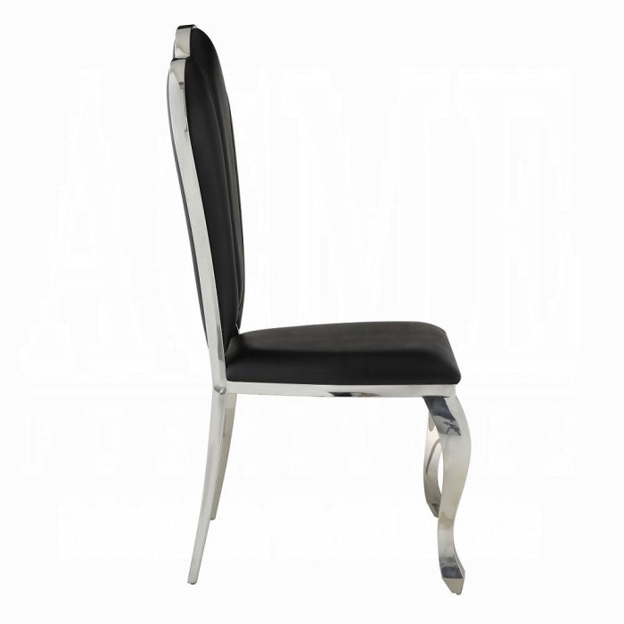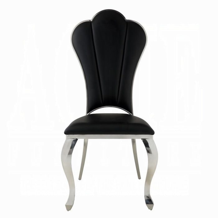 The Cyrene side chairs offer a visually stunning place to sit and enjoy meals. This Set-2 includes two chairs featuring a scalloped silhouette, a gleaming stainless-steel frame, and soft black PU upholstery. The padded seats provide long-lasting comfort that makes every meal a pleasure.