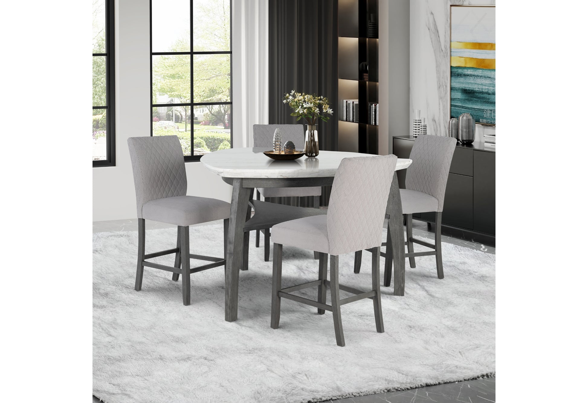 - Includes four bar stools for a ready-to-use seating arrangement