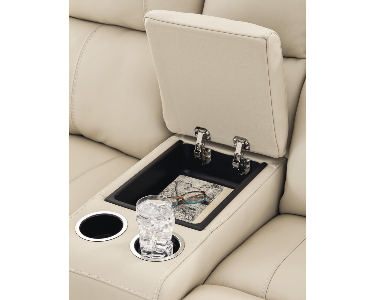 - Built-in console with cupholders keeps drinks, remotes, and essentials within easy reach.