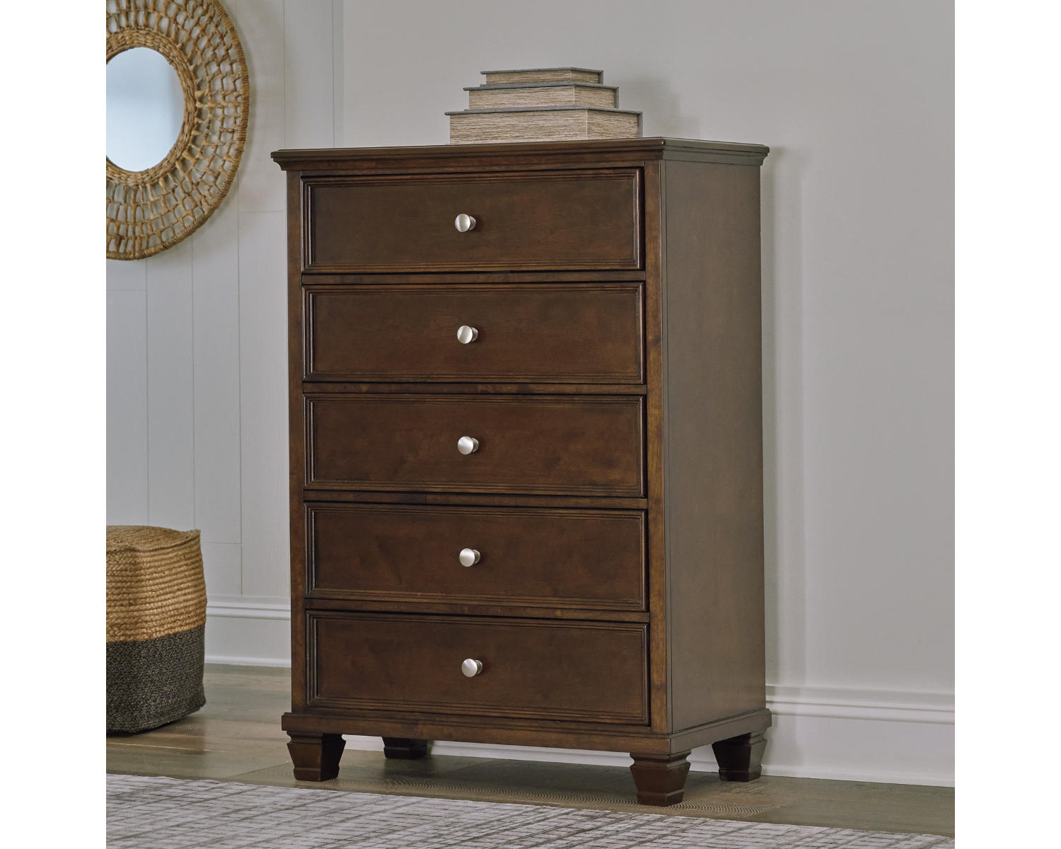 Meet the Danabrin Chest of Drawers—a compact, five-drawer storage solution designed for bedrooms and living spaces that need tidy organization. The brown finish blends with a variety of decors, offering both style and practicality for everyday use. This chest helps you keep clothing, linens, and accessories neatly arranged at hand.