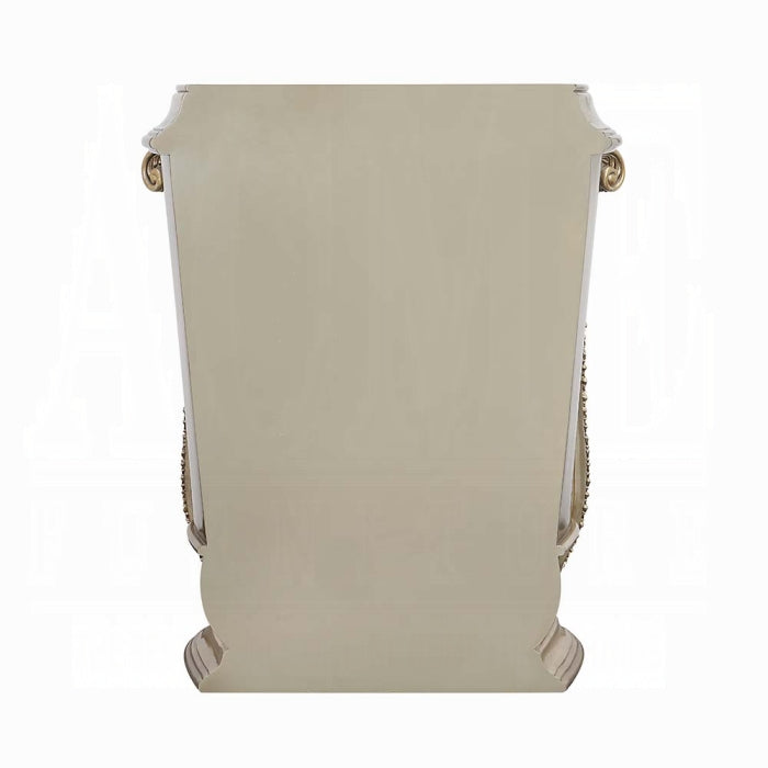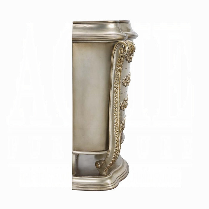 Feast your eyes on the decadence of the Danae collection with this striking chest. Created to make a statement, this regal piece elevates storage with carved curves and opulent detailing. The Champagne finish with gold accents enhances the sculpted charm, making it a centerpiece in any room.