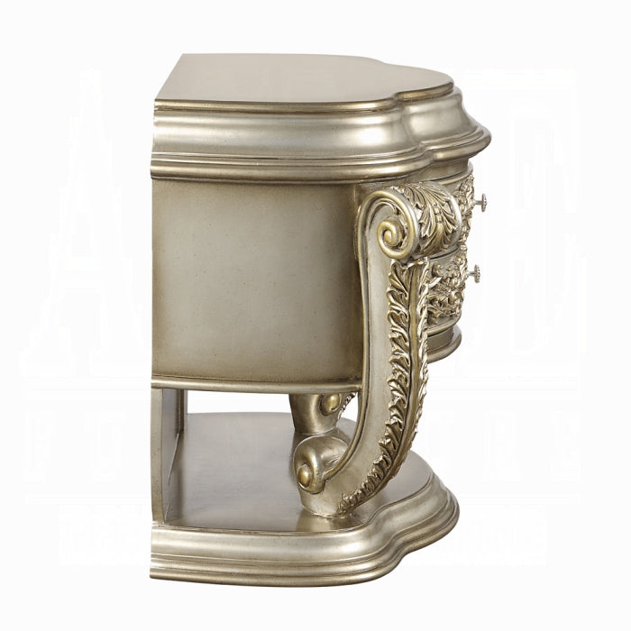 Featuring a Champagne finish and gold accents, its sculpted curves and intricate details evoke timeless elegance. This nightstand is crafted to complement opulent beds while standing on its own as a statement piece.