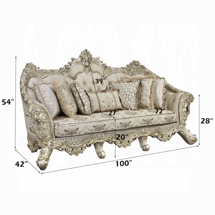 Meet the Danae sofa, a regal centerpiece designed to elevate any living space. With over-the-top crown and floral moldings, it reflects the inner royalty in you. The tufted backrest adds timeless charm, while the 7 included pillows enhance comfort and style.