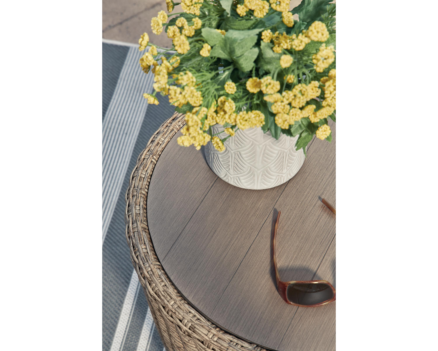 The Danson Outdoor End Table is a round, beige end table designed for outdoor living. Perfect beside lounge seating on patios, decks, or balconies, it adds a convenient surface for beverages, books, or plants while blending with a wide range of décor styles.