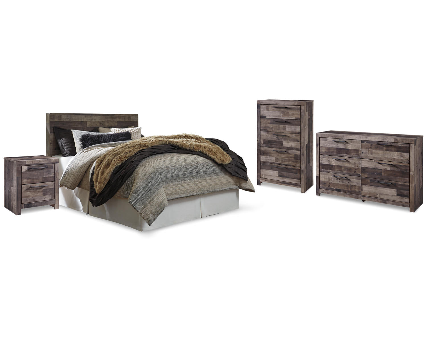 Elevate your bedroom with a complete Derekson set designed for queen-size comfort and cohesive style. This four-piece collection includes a panel headboard, a dresser, a chest, and a nightstand in a versatile multi gray finish. Built for everyday use, it brings clean lines and timeless appeal to modern spaces.