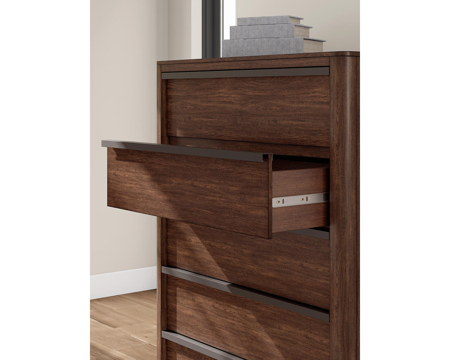 - Five drawers provide generous vertical storage for clothes, linens, and personal items.