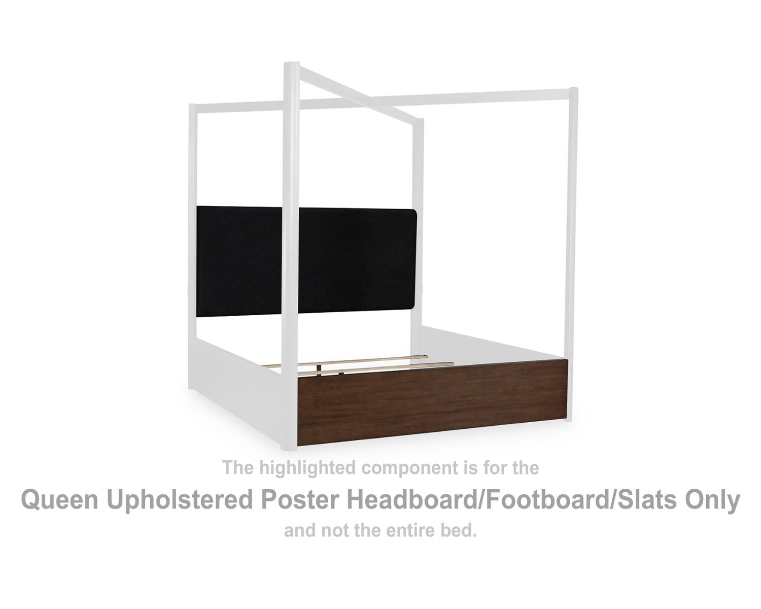 - Queen-size upholstered poster bed with integrated headboard and footboard