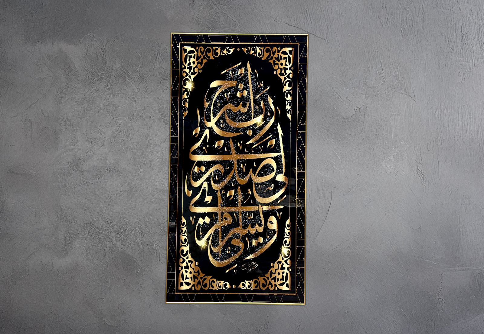 Divine Script Artwork is a beautifully intricate Islamic calligraphy piece featuring a black and gold palette that radiates spiritual wisdom and sacred elegance. Designed for living rooms, prayer spaces, galleries, or any area where refined art is appreciated, this artwork adds a sense of reverence and timeless style. It blends traditional script with a modern, versatile aesthetic to elevate any decor.