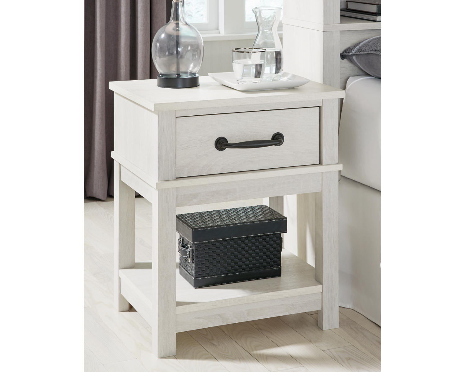 Meet the Dorrinson Nightstand, a clean white bedside companion designed for bedrooms that value simple, reliable storage. This one-drawer nightstand is perfect for small spaces and modern decor, keeping essentials close at hand while maintaining an uncluttered look.