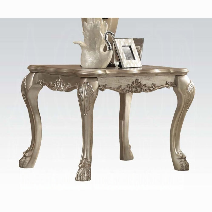 Meet the Dresden End Table, a traditional centerpiece designed to bring timeless elegance to any living space. Its oversized claw feet, decorative carving, and inlay veneers create a refined profile that elevates décor while remaining practical for daily use. Finished in Gold Patina & Bone, this table serves as a stylish showpiece and a versatile surface for lamps, books, or beverages.