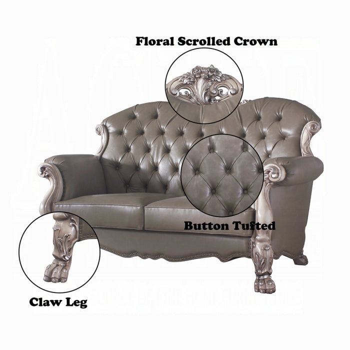 Meet the Dresden loveseat, a new design that brings a classic, elegant touch to your living space. With a vintage bone white finish, this loveseat blends timeless charm with versatile style, ideal for traditional and transitional rooms. Hand-crafted with inspiration from luxurious designs of the past, the Dresden loveseat showcases elaborate wood carving details and a graceful silhouette.