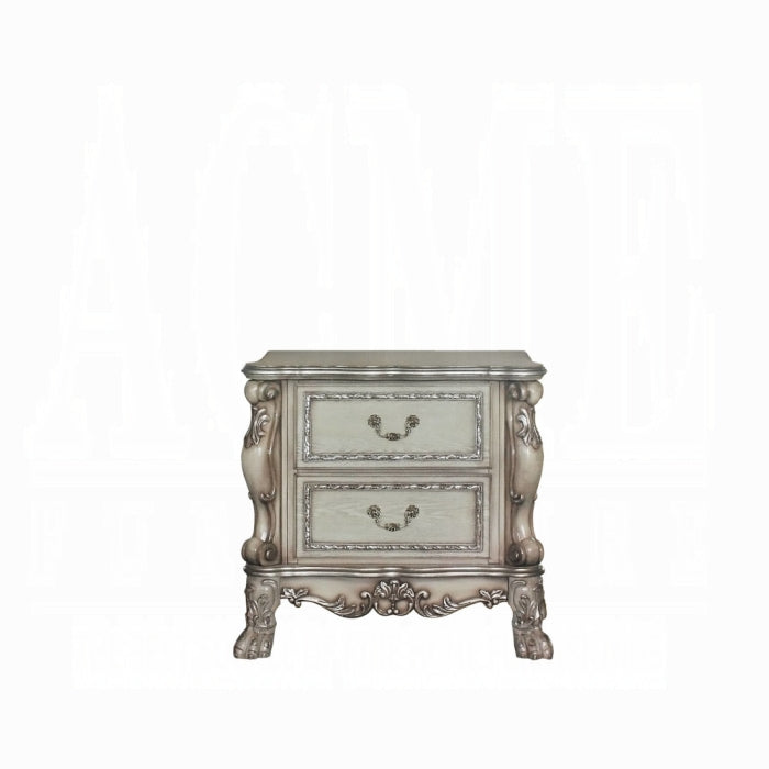 Elegant yet lightheartedly playful, the Dresden nightstand is donned in an amiable vintage bone white finish with hand-applied burnish over the many layers of stains and finishes that are manually rubbed on, providing depth and character to this piece. The Rococo style is candidly represented in the piece’s graceful silhouette, adding a refined touch to any bedroom.