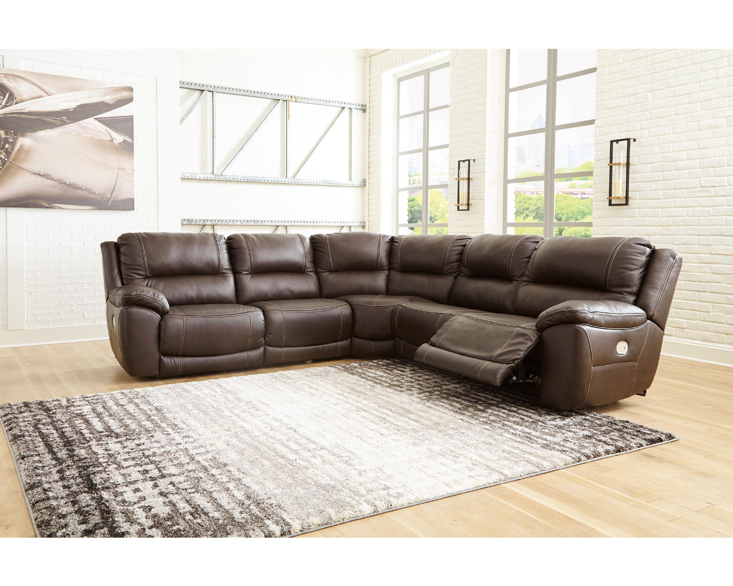 Meet the Dunleith 5-Piece Power Reclining Sectional in chocolate. This versatile set blends modern style with effortless comfort, making it a smart choice for family rooms and entertaining spaces. Designed for everyday living, it offers flexible layouts and reclining ease at the touch of a button.