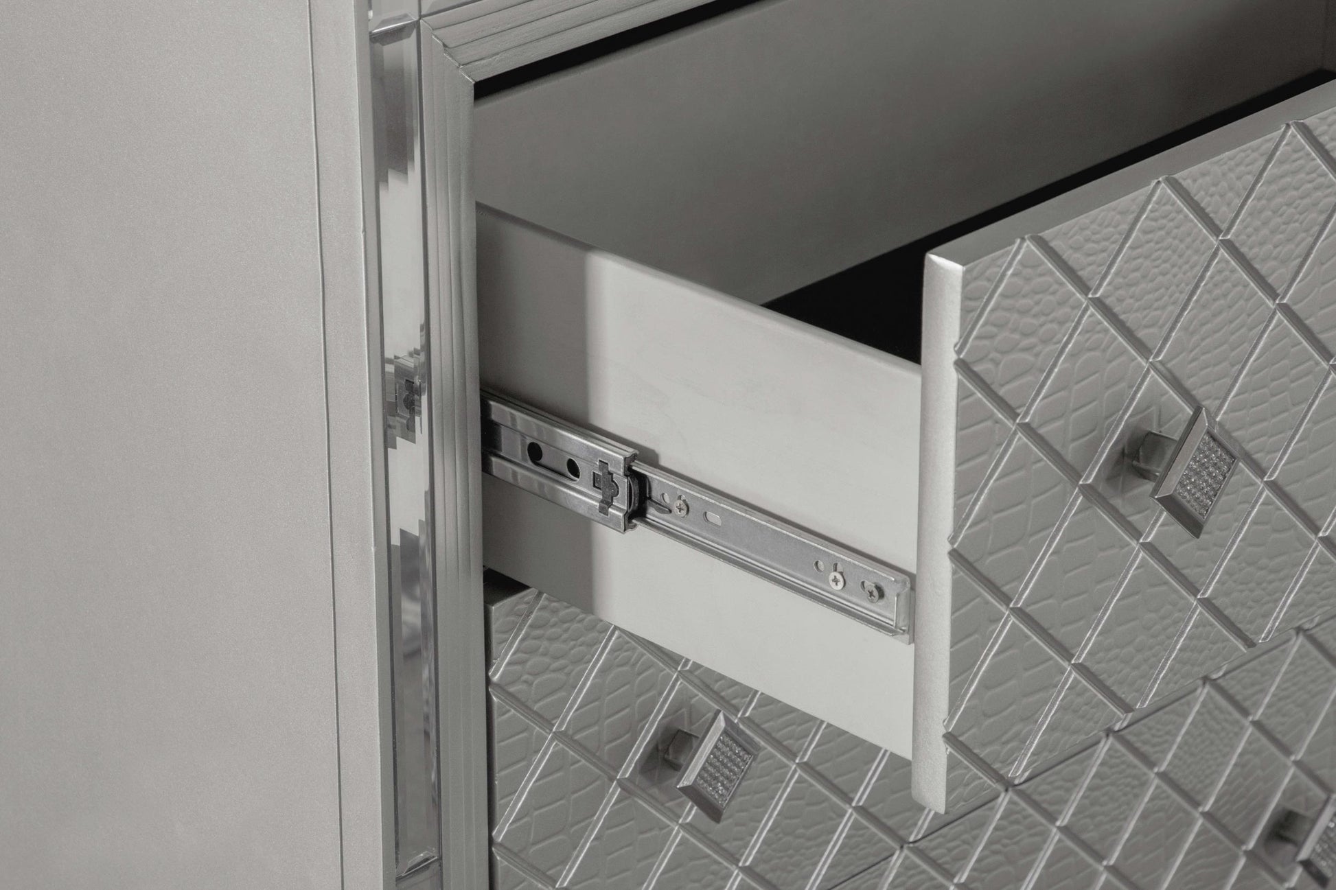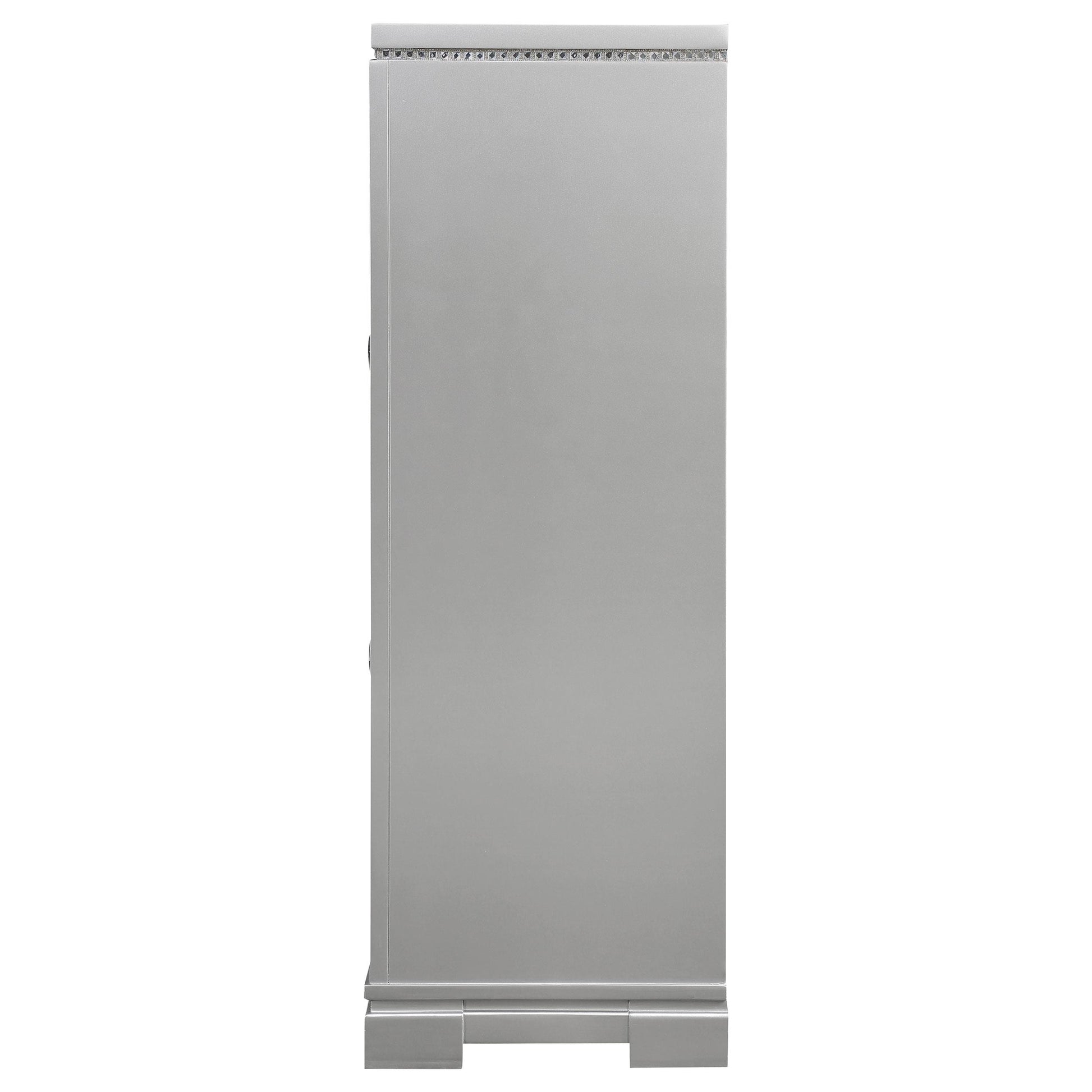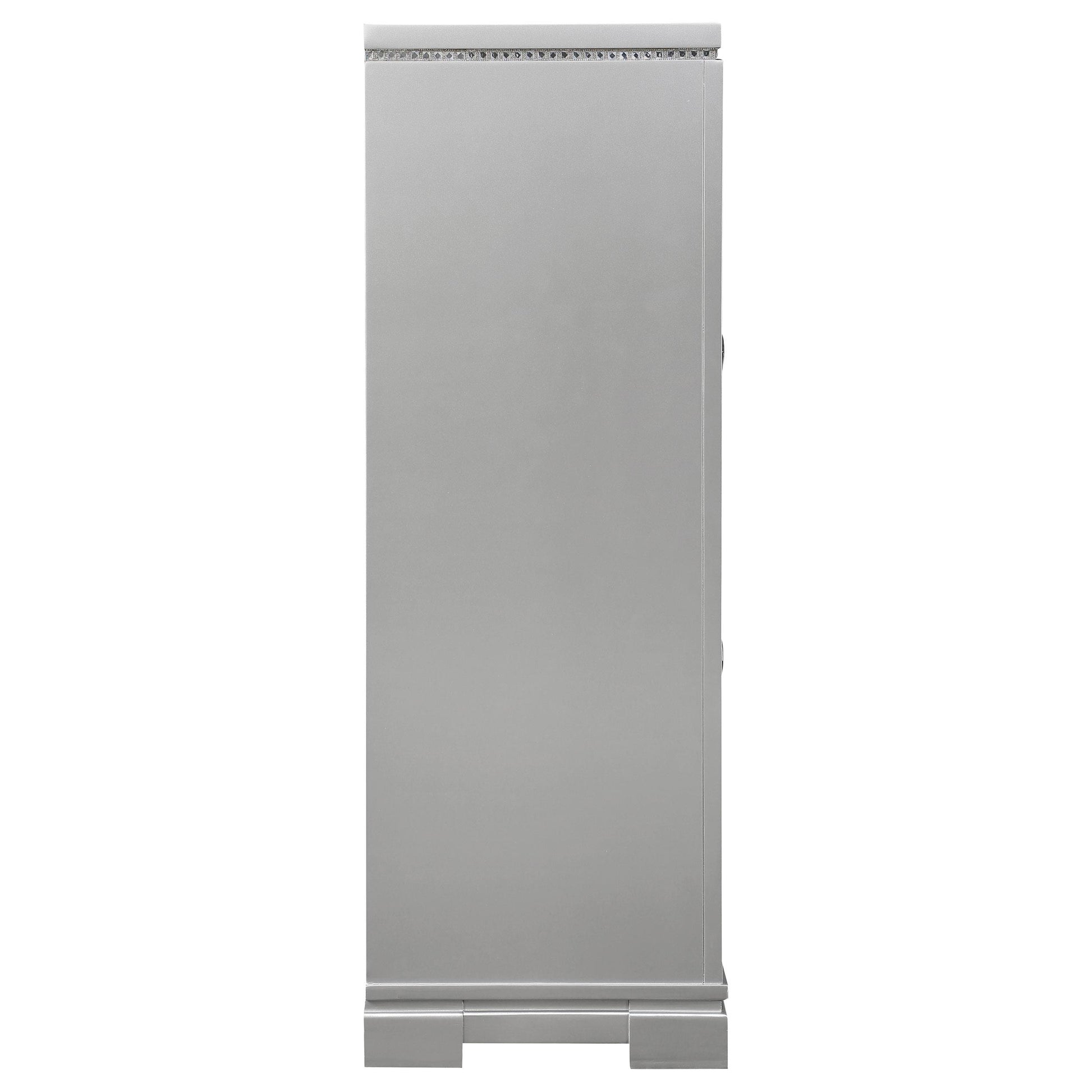 The Eleanor 5-drawer Bedroom Chest in Metallic Mercury brings a streamlined storage solution to your bedroom. Crafted to fit modern and transitional interiors, it combines practical organization with a chic metallic finish. This chest is ideal for keeping clothes, accessories, and essentials neatly arranged within arm's reach.