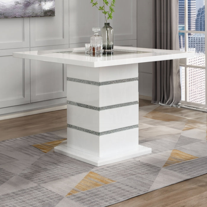 Perfect for a kitchen nook or a smaller dining space, the Elizaveta counter height dining table will fulfill all your dining needs. The white high gloss finish blends in perfectly with the glimmering faux diamond inlay base. The tabletop features silver and black faux diamonds for an added wow factor.