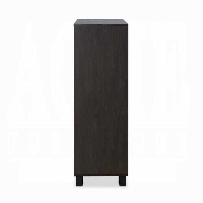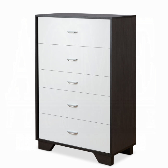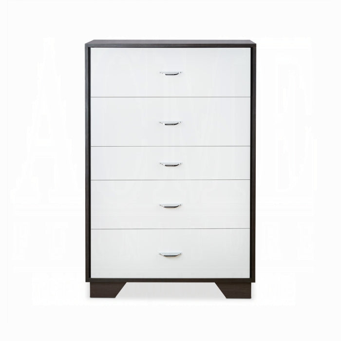 Introducing the Eloy Chest—a contemporary five-drawer dresser designed for modern bedrooms. With an espresso finish featuring multi shades and a raw wood texture, it blends sleek style with practical storage for clothes and more.