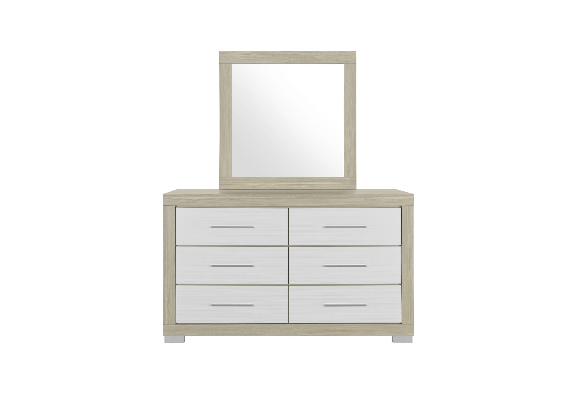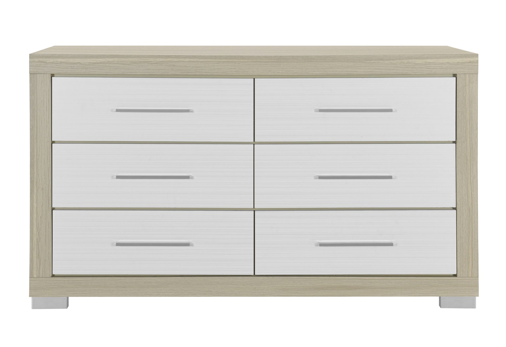 Emma Natural/White Dresser is a versatile storage piece designed for modern bedrooms. Its two-tone finish blends the warmth of natural wood with crisp white accents, offering a timeless look that matches a wide range of decor. This dresser provides practical storage and a clean, refined silhouette for everyday organization.