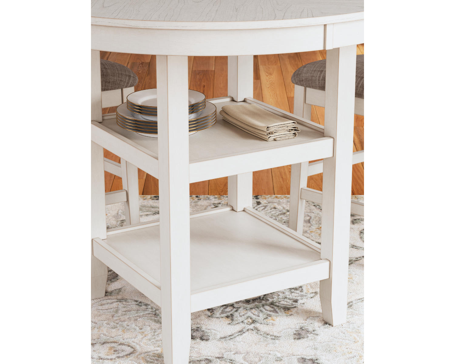 Meet the Erinberg Counter Height Dining Table and 4 Barstools. This five-piece set is ideal for small kitchens, breakfast nooks, or casual dining spaces. Finished in antique white, it combines timeless style with practical versatility.