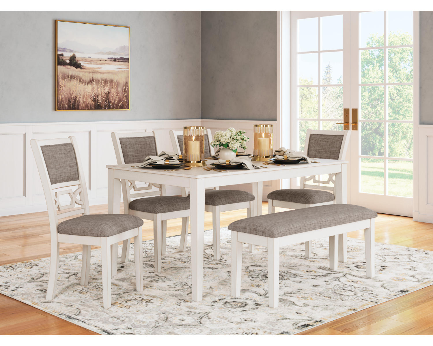 Meet the Erinberg dining set—a versatile six-piece collection that brings timeless charm to any dining space. This complete set includes a spacious dining table, four chairs, and a bench, all finished in an inviting antique white. It’s designed for everyday family meals and special gatherings alike, offering classic style with practical function.