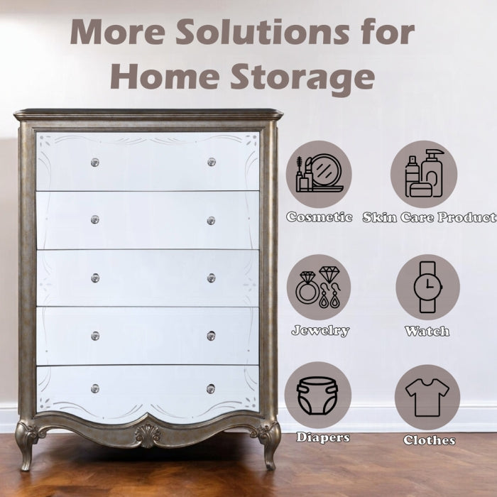 Compared to similar chests in its class, this piece delivers a competitive price point without compromising on construction or finish. The antique champagne finish offers a refined look that ages well with room decor, while the five-drawer configuration maximizes storage without occupying excessive floor space. For safe delivery, the item ships LTL with ISTA-3A approved packaging to help protect the finish and hardware in transit.