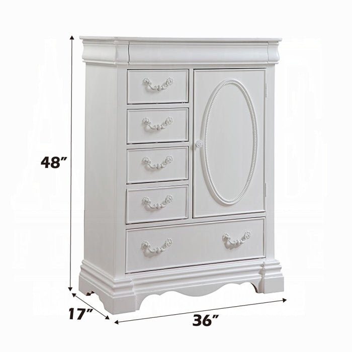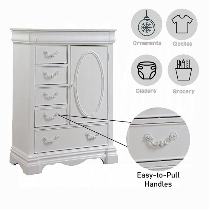 Meet the Estrella Chest, a white-finish wood storage piece designed for bedrooms, living rooms, or entryways. It combines clean lines with practical organization, making it easy to declutter spaces. The centerpiece features a 6-drawer and door configuration with two shelves and a hidden top drawer for versatile storage.