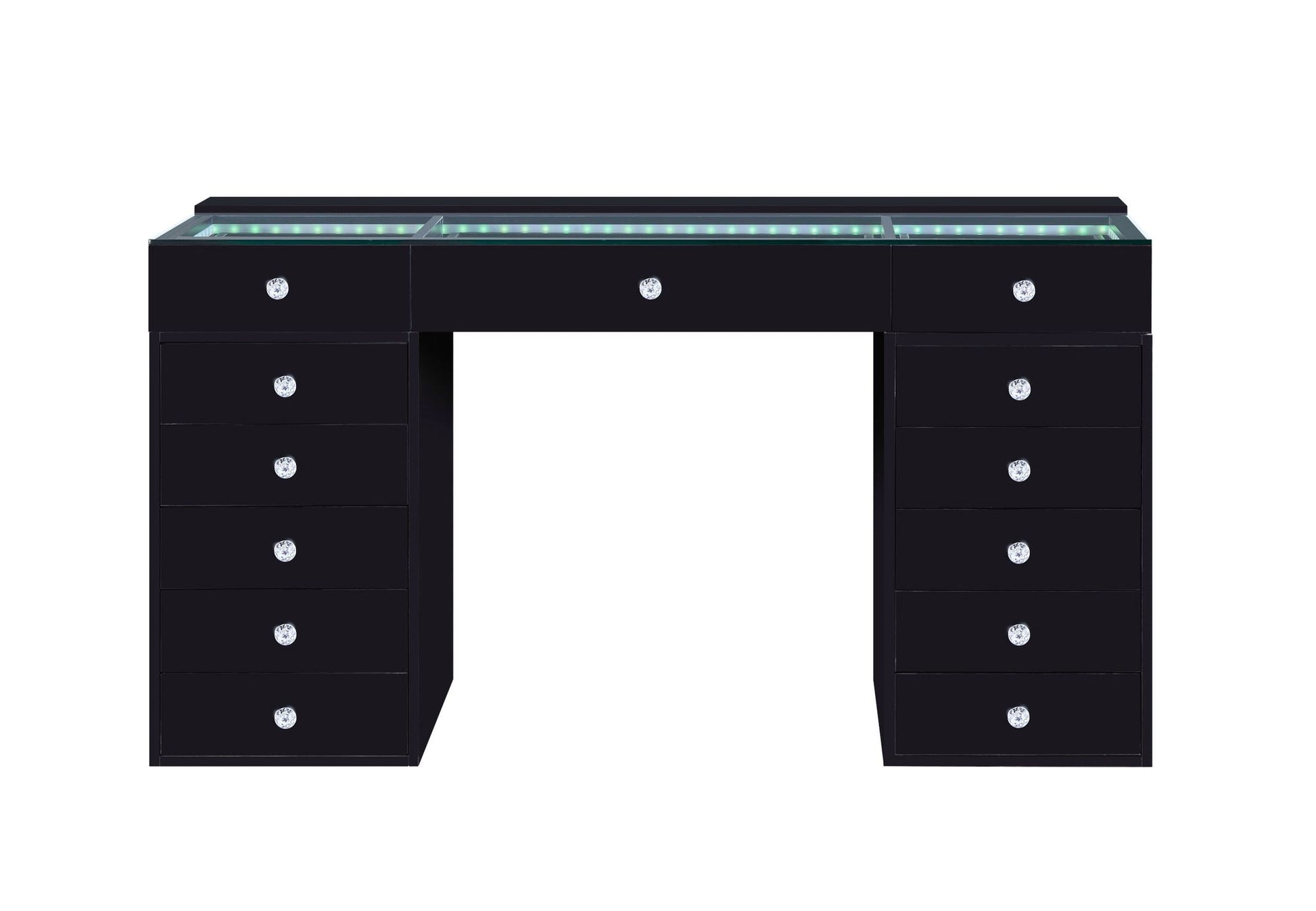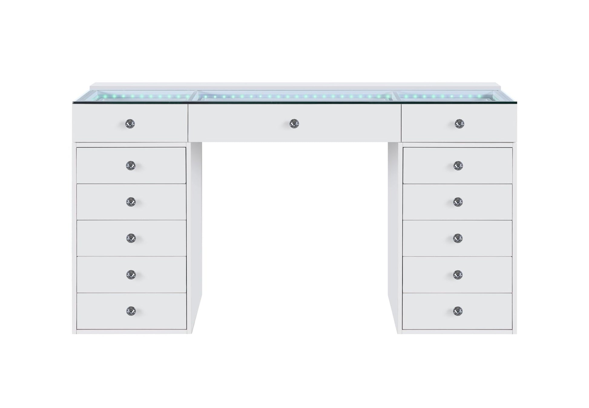 The Eva Vanity is a sleek, modern vanity desk designed for beauty professionals and personal glam spaces. It combines a tempered glass top with integrated LED lighting and ample drawer storage. This desk brings a professional, tidy aesthetic to any makeup routine.