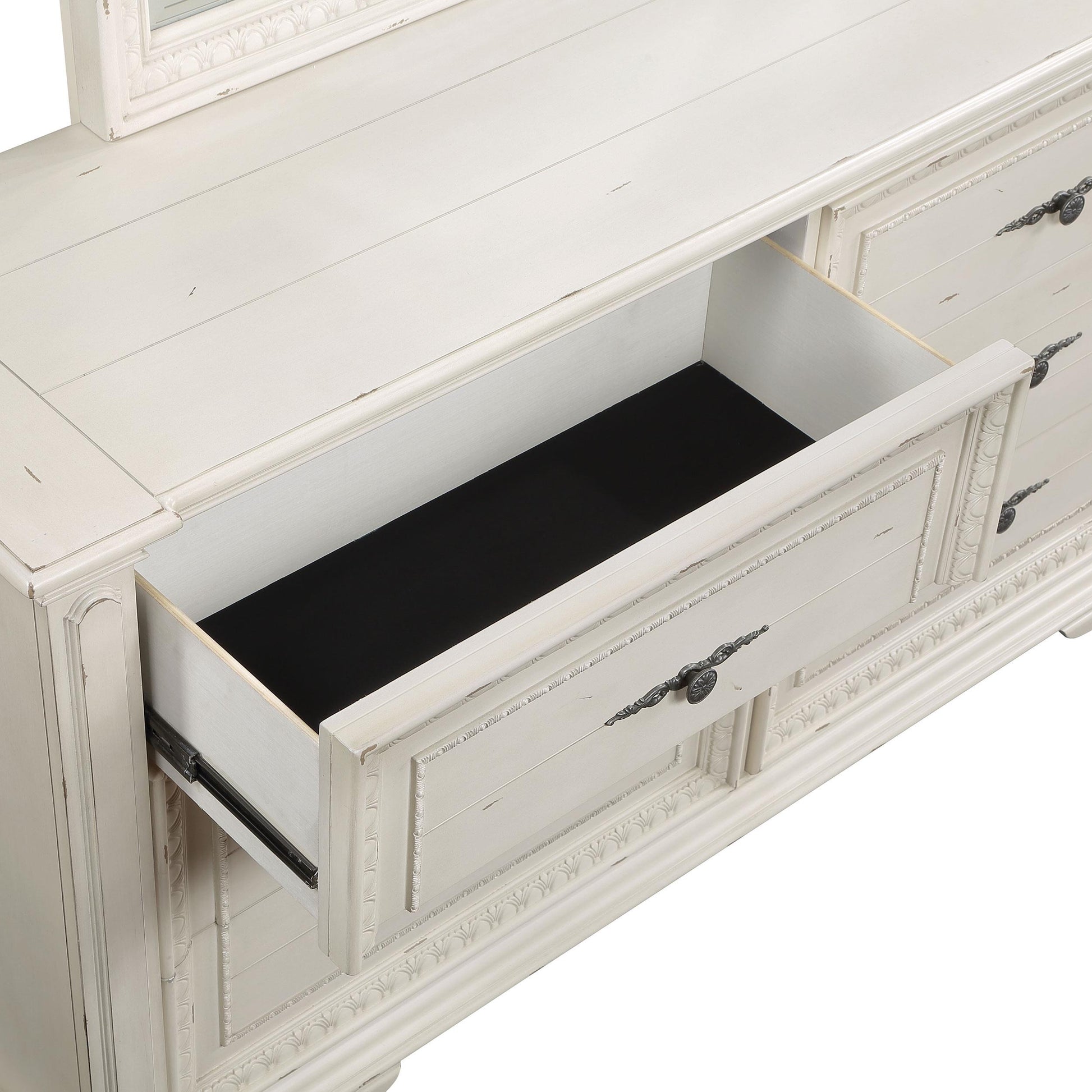 With its antique white finish and timeless silhouette, the Evelyn dresser with mirror brings essential storage and classic style to any bedroom. It is designed for daily use and is ideal for those who value organization and a refined look. This piece pairs well with a range of decor—from vintage-inspired to modern farmhouse.