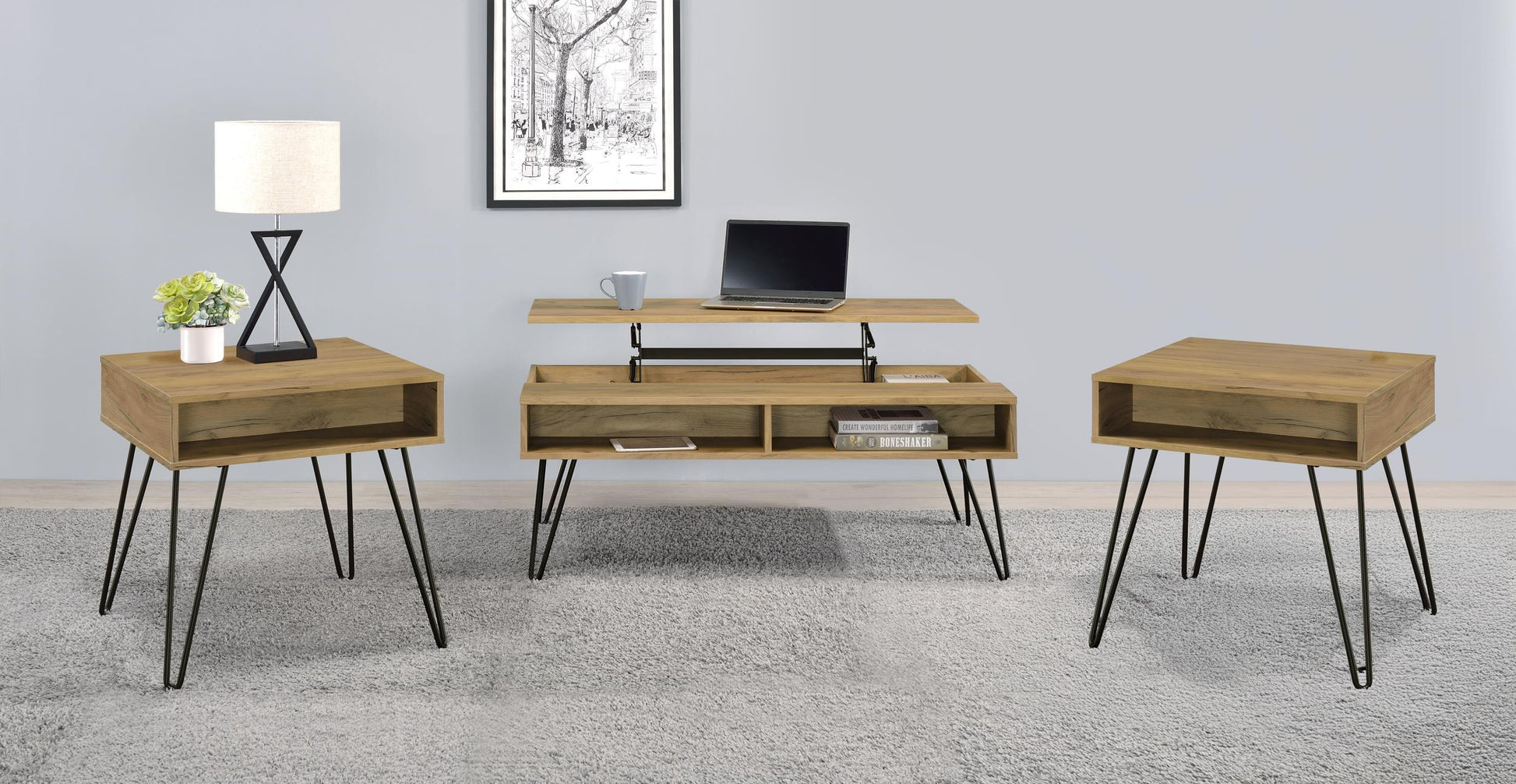 The Fanning 3-piece set is built to stand up to everyday living. Its sturdy build and well-chosen joinery provide dependable support for drinks, books, laptops, and more, while the lift-top mechanism adds versatility without compromising style. Compared with similar lift-top table sets, this Golden Oak collection offers strong value by delivering a complete, cohesive look at a competitive price point.