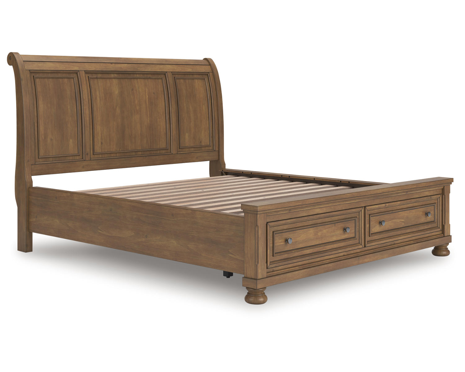 Introducing the Feddinger California King Storage Sleigh Bed in Medium Brown—a functional centerpiece for contemporary bedrooms. This bed blends the elegant curves of a sleigh silhouette with practical storage, making it ideal for bedrooms that value organization without sacrificing style.